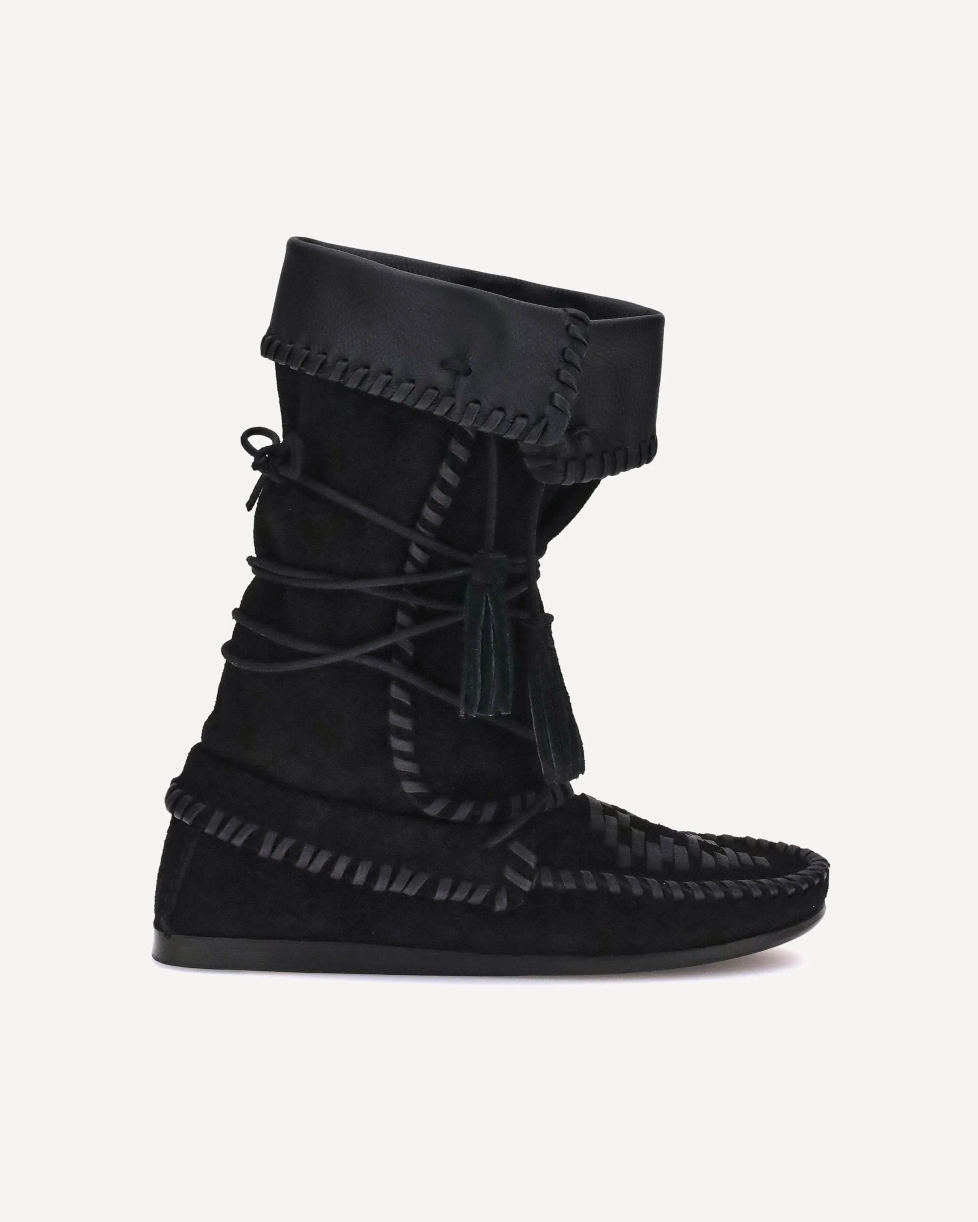 Isabel Marant's Winki Boots combine refined style with handcrafted details. Made of suede calfskin with leather trim, they feature a strap fastening and an ankle length for a modern look. Layered details, whipstitch trim, decorative stitching, and distinctive tassel detail enrich the design, while the almond toe lends a touch of timeless elegance. DETAILS - Sku: BO0210FAC2A05S_01BK - Season: AW25 - Composition: GENERAL 100% Calf Leather Bos Taurus - MADE IN FRANCE