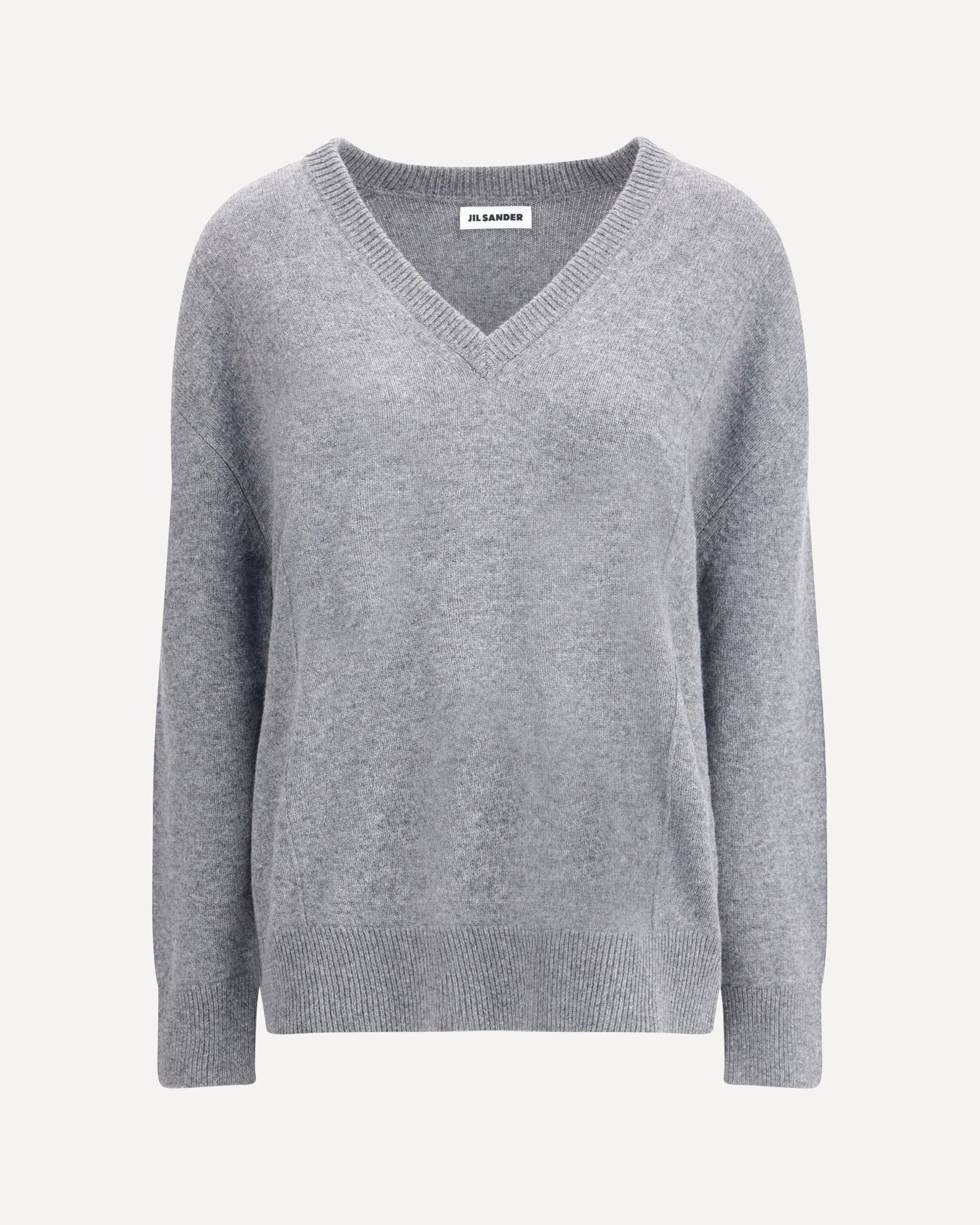 The Oversize Sweater by Jil Sander in Wool and Cashmere blend is an essential piece with a contemporary design. Ribbed V-neckline, cuffs, and hemline enhance the soft and enveloping silhouette. Ideal for minimalist and refined looks DETAILS - Sku: J03GP0168J14818_026 - Season: AW25 - Fit: Oversize - Composition: GENERAL 70% Wool 30% Kashmir/capra Hircus - MADE IN ITALY