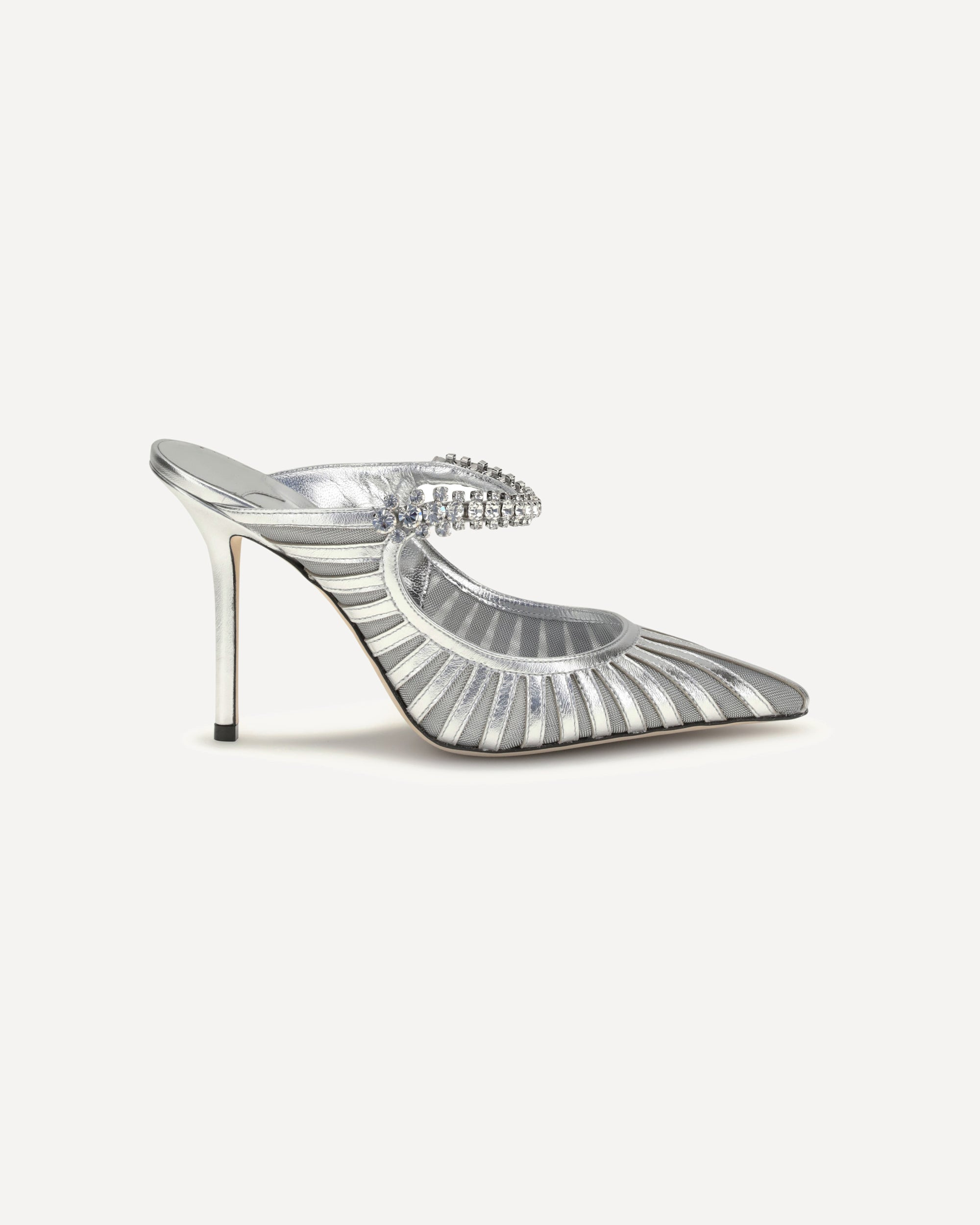 The Bing 100 Sabot by Jimmy Choo feature a silver metallic weave. The crystal band, a detail that characterizes the brand gives light and makes the shoe a precious accessory capable of standing out any look. DETAILS - Sku: J000175920_SILVER - Season: AW25 - Composition: GENERAL 100% Leather - MADE IN ITALY