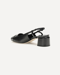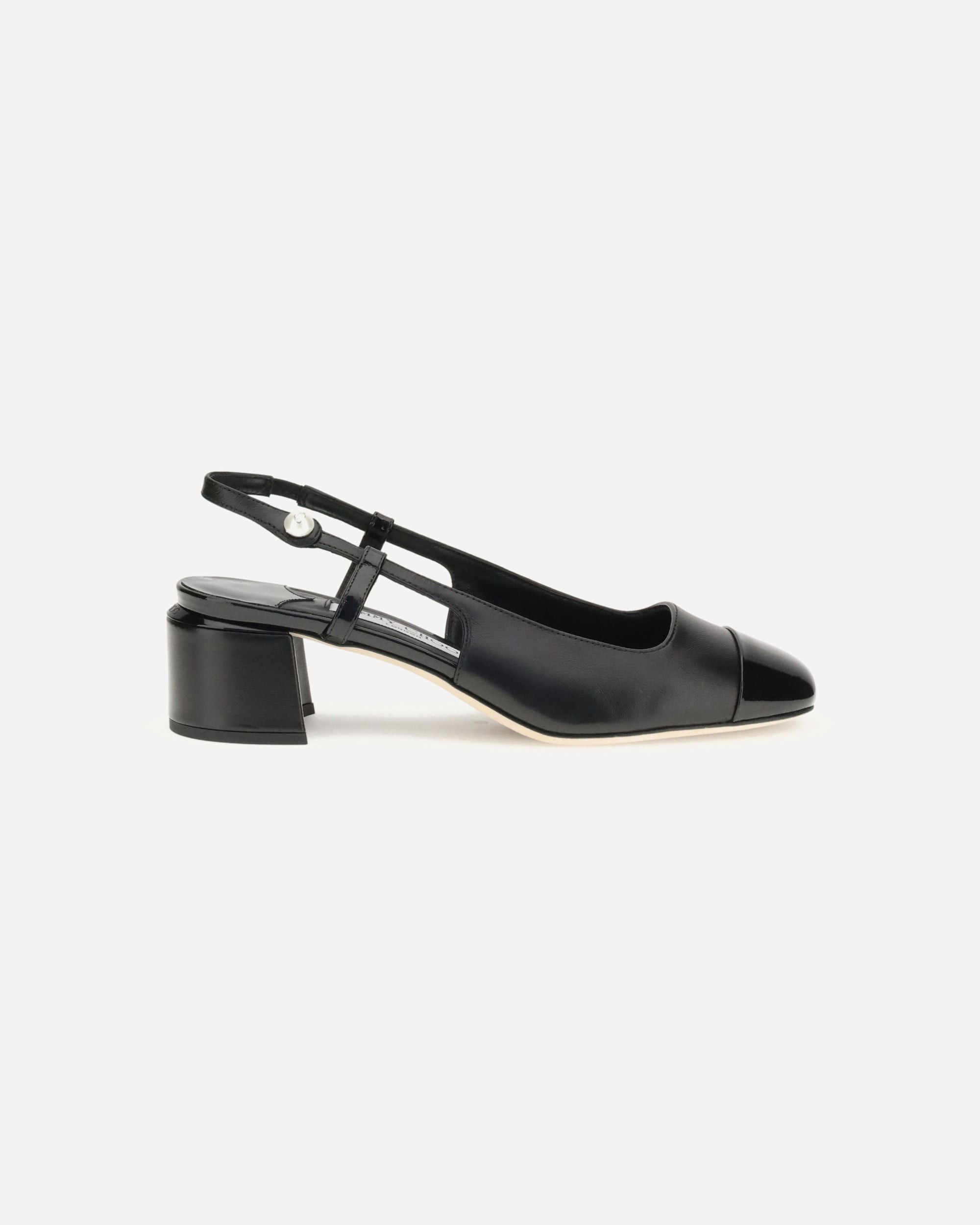 Jimmy Choo's Elisa Pumps reinterpret classic elegance with a modern twist. The slingback design with block heel offers stability and style, while the slightly squared toe gives a bold profile. The polished leather finish on the toe adds a refined accent, perfect for completing both formal and sophisticatedly casual looks. DETAILS - Sku: J000178668_BLACKBLACK - Season: AW25 - Composition: GENERAL 100% Calf Leather Bos Taurus - MADE IN ITALY