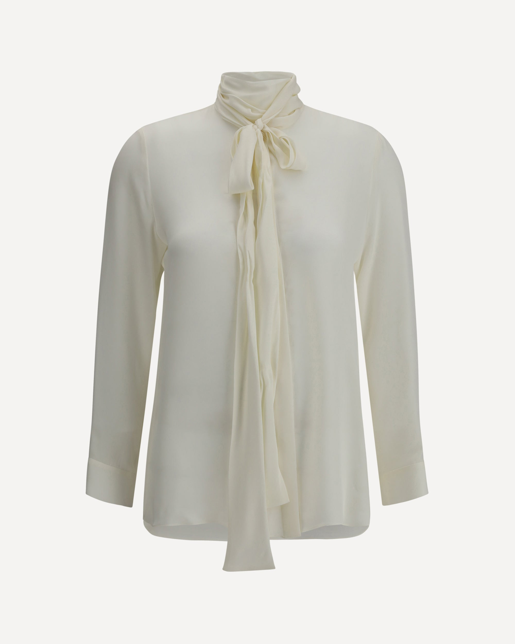 The Khaite Tash Silk Shirt is a luxurious piece that combines elegance and sophistication. The concealed button front closure gives it a clean and sophisticated look, while the adjustable button cuffs allow you to customize the fit to suit your style. The semi-sheer design adds a sensual and delicate touch, without compromising the class of the piece. The self-tie sash collar offers a customization option that allows you to play with the style, creating an elegant and versatile effect. DETAILS sku 2282338W338_103 composition: SILK 100% color group: WHITE gender: WOMAN season: SS25 size chart: RTW US category name: TOP