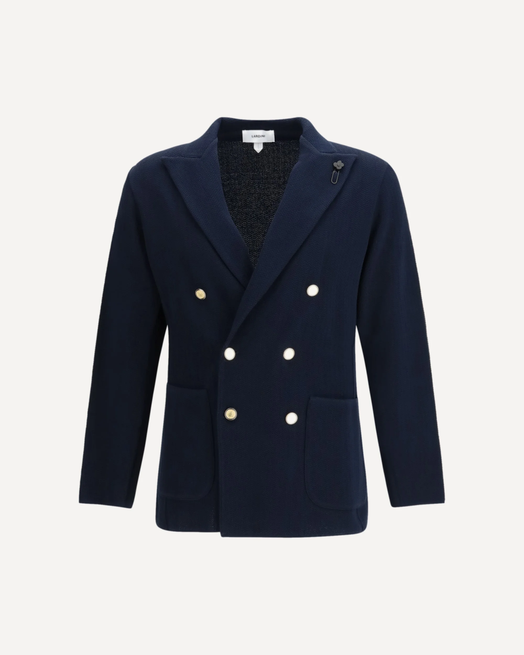 The knit Blazer by Lardini is a garment that combines elegance and comfort in a sophisticated design. The double-breasted model with peaked lapels gives it a classic silhouette, enhanced by the iconic pin on the lapel, the brand's distinctive symbol. The two side patch pockets complete the look, adding functionality and practicality. Perfect for those looking for a formal-style blazer with a modern and innovative touch, thanks to the knit fabric that makes it ideal for any season. DETAILS - Sku: CNLJM57HPA66001_850 - Season: SS26 - Fit: Regular - Composition: GENERAL 100% Cotton - MADE IN ITALY