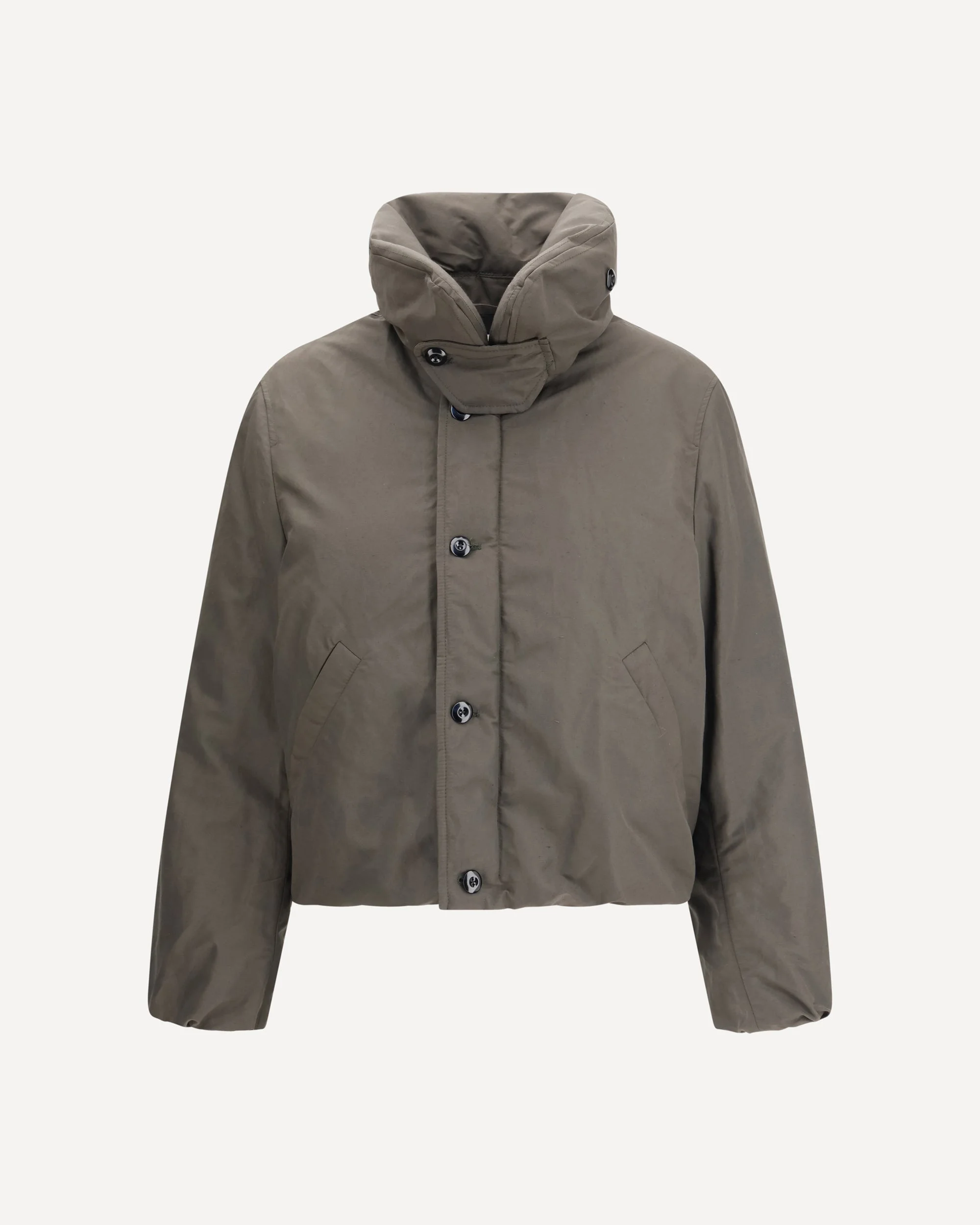 The Short Puffer Blouson by Lemaire is crafted from a water-repellent linen and cotton blend, offering both style and protection against cool weather. Designed with a straight cut slightly cinched at the waist, it is fully lined and quilted for warmth and comfort. The bubble collar with chin strap lends a distinctive character, while the zip and button closure ensure optimal coverage. Long sleeves with elasticated cuffs, snap-fastened side pockets, and an adjustable internal drawstring add functionality and versatility. An inside pocket with snap closure completes this refined and contemporary design. DETAILS - Sku: OW1151LF1019_BR507 - Season: AW25 - Fit: Regular - Composition: OUTER 44% Polyamide 32% Linen 24% Cotton INNER 100% Cotton - MADE IN TUNISIA