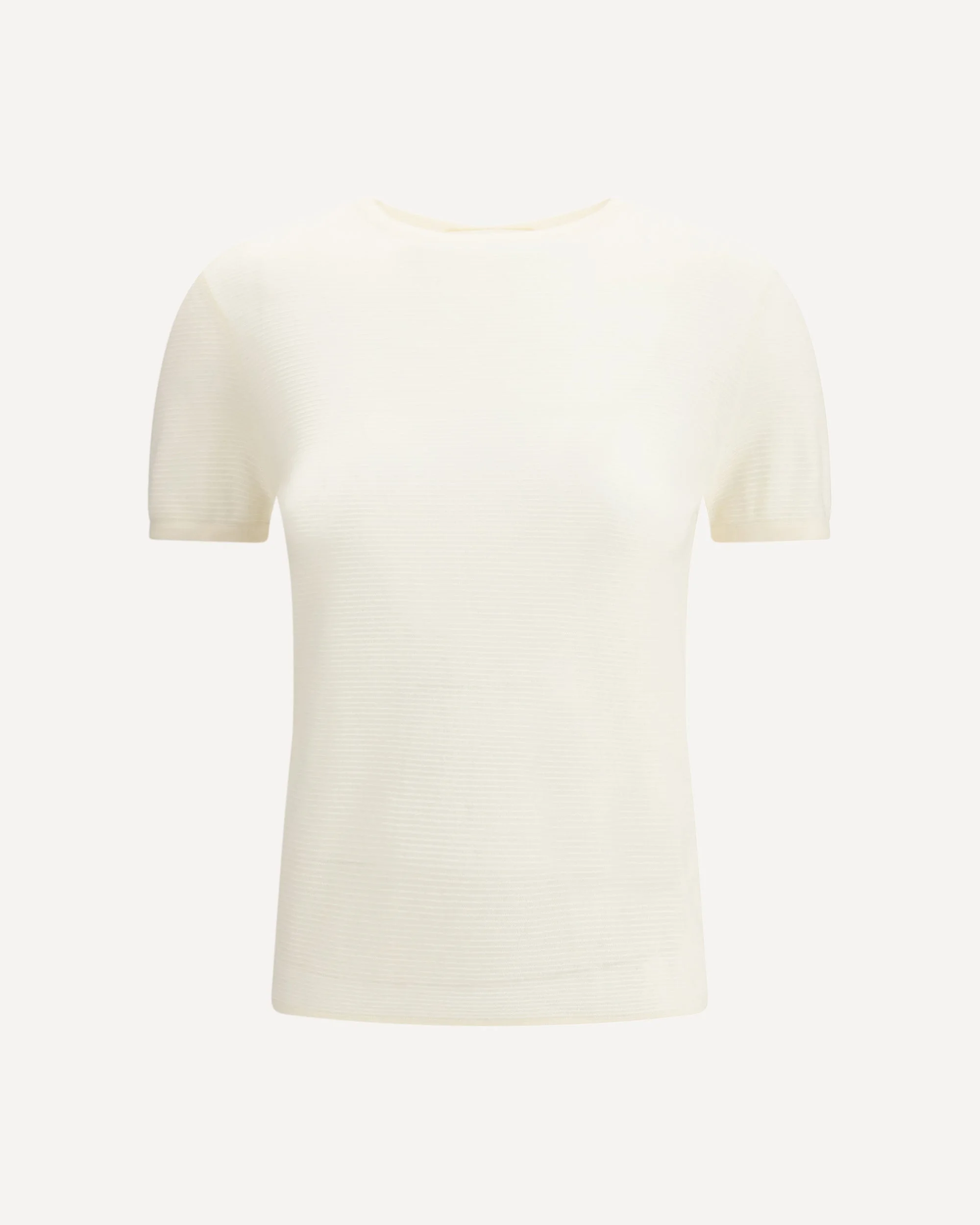 The Ira T-shirt by Lisa Yang is crafted from featherlight 18-gauge fine-knit cashmere, defined by a delicate hand and a subtle sheer effect created through its reverse horizontal rib. The fitted silhouette follows the body with ease, enhanced by a clean round neckline and neat short sleeves. Ideal as an elegant layering piece or a year-round essential, it reflects Lisa Yang’s refined and minimalist approach. DETAILS - Sku: 2025101_IV - Season: SS26 - Fit: Slim - Composition: GENERAL 100% Kashmir/capra Hircus - MADE IN CHINA