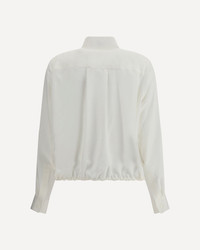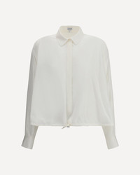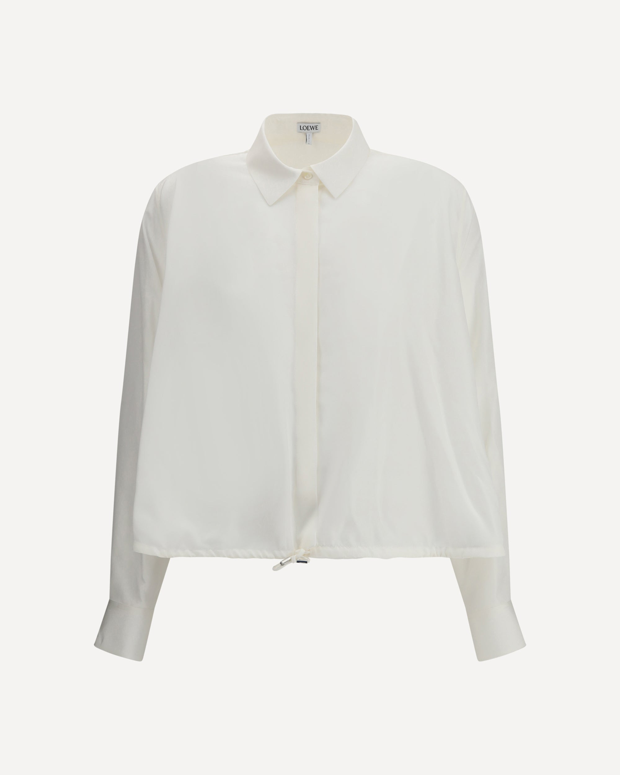 Loewe's Balloon Shirt, made from lightweight matte silk crepe, combines elegance with a touch of originality thanks to its voluminous, wrap-around silhouette. The classic collar and concealed front button closure maintain a clean, refined aesthetic, while button cuffs add functionality and attention to detail. The adjustable drawstring hem at the front allows you to modulate the fit and volume, making the garment versatile and dynamic. DETAILS - Sku: S359Y05XET_2100 - Season: AW25 - Fit: Regular - Composition: GENERAL 100% Silk - MADE IN ITALY