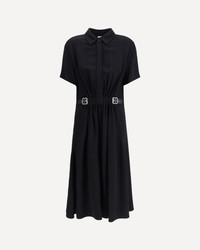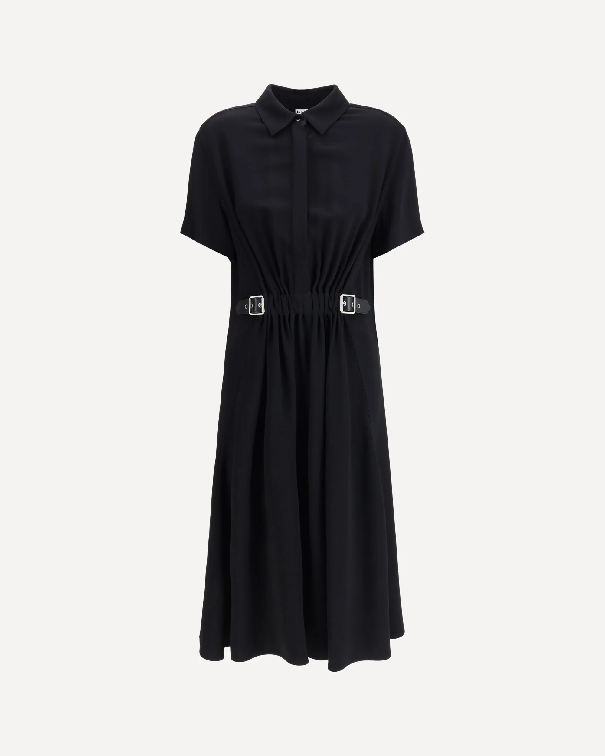 The belted Dress by Loewe combines elegance and ease in a refined silhouette. The design features a ruffle at the front that gives movement to the line and a leather belt that delicately emphasizes the waist. The classic collar and front closure with concealed buttons lend understated elegance, while the overlapping pleats at the back add a touch of contemporary femininity. The regular-fit, knee-length dress is embellished with applied Anagram embroidery on the back, an iconic detail that reflects Loewe's craftsmanship and distinctive style. DETAILS - Sku: S540Y09XTW_1100 - Season: AW25 - Fit: Regular - Composition: GENERAL 96% Viscose 4% Elastane - MADE IN ITALY