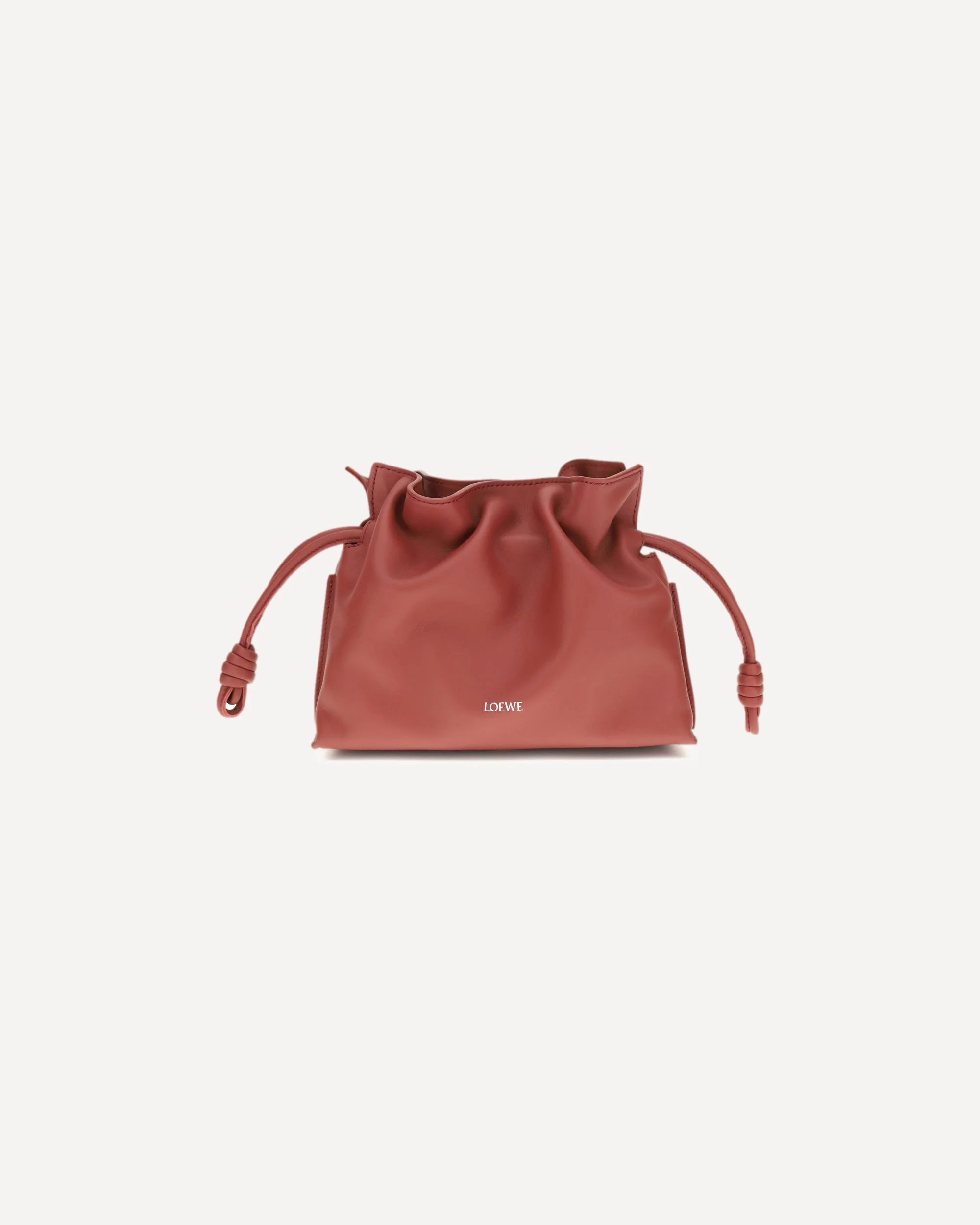The Loewe Flamenco mini leather Pouch Bag features a magnetic top closure, enriched by a drawstring with the characteristic spiral leather knots, which enhance its distinctive design. The flat leather shoulder strap is removable and adjustable, offering versatility in use. The iconic logo of the brand is pressure-printed on the front, adding an elegant touch. The interior is a single compartment, perfect for carrying essentials. A sophisticated and practical accessory, perfect for any occasion. DETAILS - Sku: A411FC2XA6_7885 - Season: SS26 - Dimension: 23.9x23.9x9 - Composition: GENERAL 100% Calf Leather Bos Taurus - MADE IN SPAIN