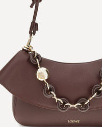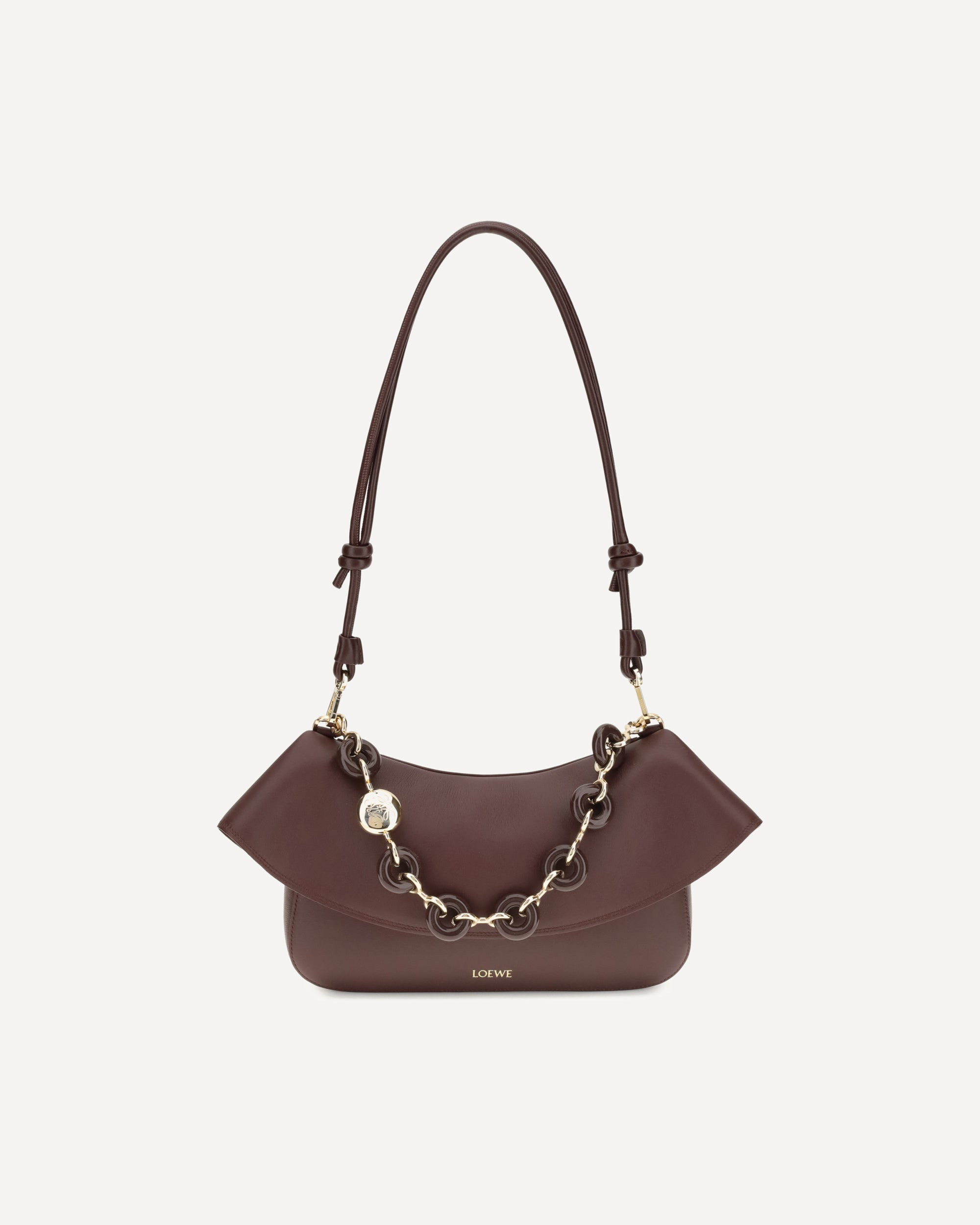 Loewe's Ola Shoulder Bag is a versatile and lightweight summer model featuring a curved body, a sliding flap, and the unmistakable Donut chain. This medium version is made of raffia, with details and removable tubular shoulder strap in calfskin leather. Fitted with a flap closure, it features an interior pocket and engraved Anagram motif. Part of Paula's Ibiza collection, it combines elegance, craftsmanship and a contemporary holiday spirit. DETAILS - Sku: AP22P22X07_7240 - Season: AW25 - Dimension: 26x26x13 - Composition: GENERAL 100% Calf Leather Bos Taurus - MADE IN SPAIN
