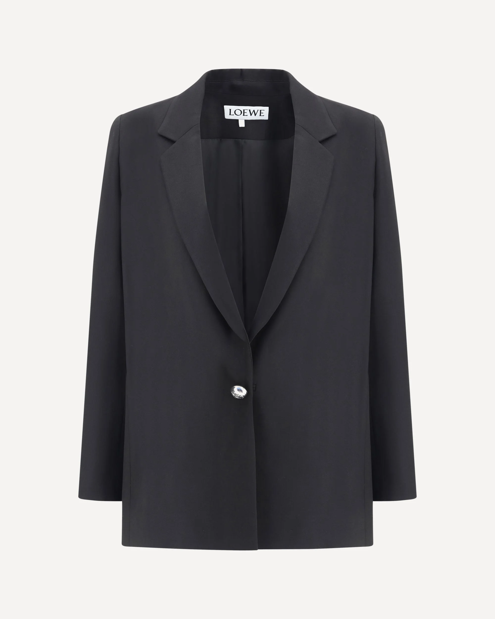 Loewe's Blazer, made of lightweight, fluid stretch viscose cady, is a garment that combines sartorial elegance and design innovation. The twisted silhouette lends movement and a contemporary touch, while the side Anagram Pebble button closure adds a distinctive and refined detail, a symbol of the brand. Classic lapels maintain a nod to tradition, balancing the originality of the shape, while button cuffs and back slits complete the garment with functionality and style. DETAILS - Sku: S359Y03XA6_1100 - Season: AW25 - Fit: Regular - Composition: GENERAL 4% Elastane 96% Viscose - MADE IN ITALY