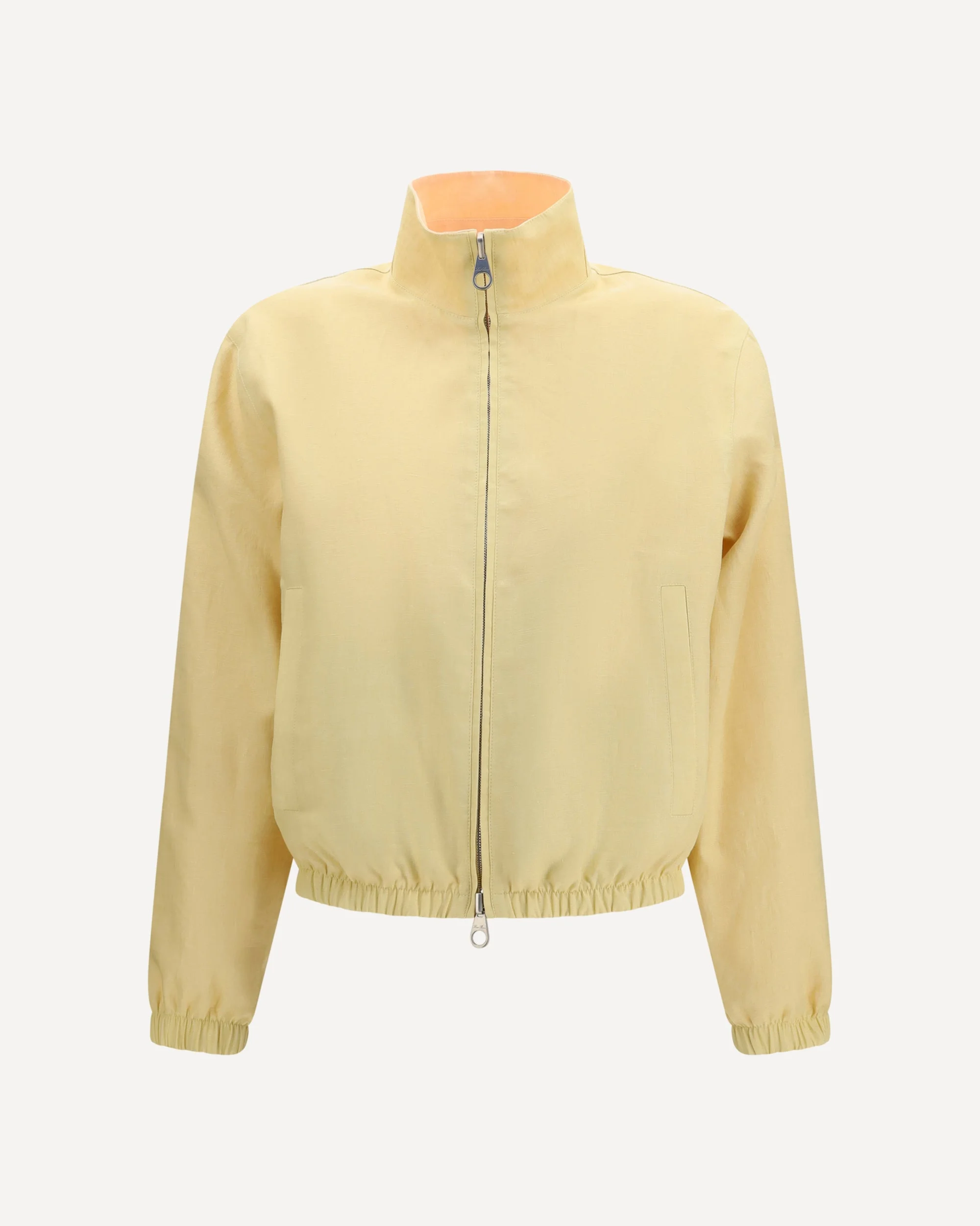 The linen bomber Jacket with Rain System® by Loro Piana finishing stands out for a refined sporty silhouette that combines versatility and functionality. The bomber model features a stand collar, elasticated cuffs and hem that define the silhouette. The two-way zip closure adds practicality, while the side welt pockets introduce a functional detail. Crafted from Solaire linen and finished with an aloe vera treatment, it offers fluid drape, wrinkle resistance and enhanced softness. Suede details along the inner collar and pockets add an elegant touch. The reversible construction completes the garment with a versatile and contemporary style. DETAILS - Sku: FAQ0520_B5ZG - Season: SS26 - Fit: Regular - Composition: GENERAL 100% Linen - MADE IN ITALY