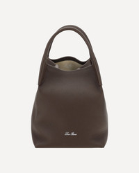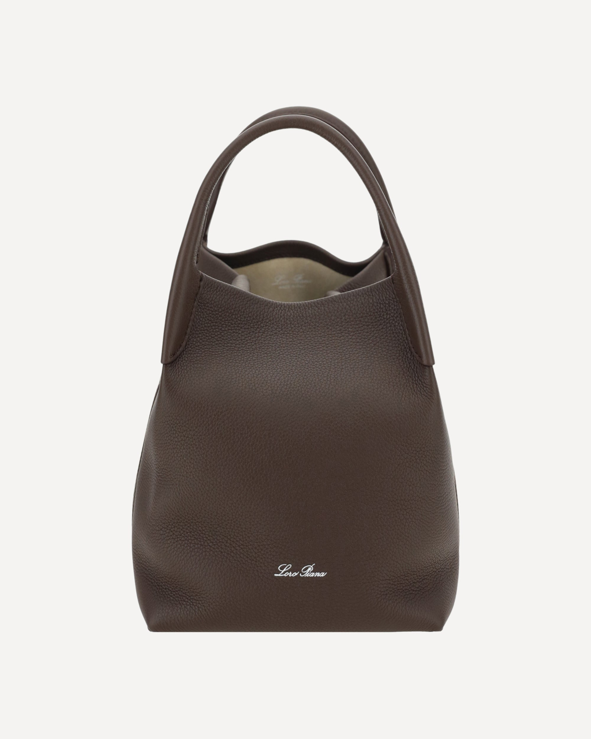 Loro Piana's Bale small Bucket Bag in grained leather features two upper rigid tubular handles that provide a stable and comfortable grip. The adjustable and removable cotton and leather shoulder strap wraps around the bag creating an elegant loop pattern, adding versatility to the design. The interior metal frog closure provides security, while the removable interior leather pouch, attached with another frog, offers additional practicality. The iconic contrasting press-on monogram on the front lends a distinctive touch, while the interior features a single compartment for simple and functional organization. DETAILS - Sku: FAN8964_H0TO - Season: AW25 - Dimension: 17x17x21 - Composition: GENERAL 100% Calf Leather Bos Taurus - MADE IN ITALY