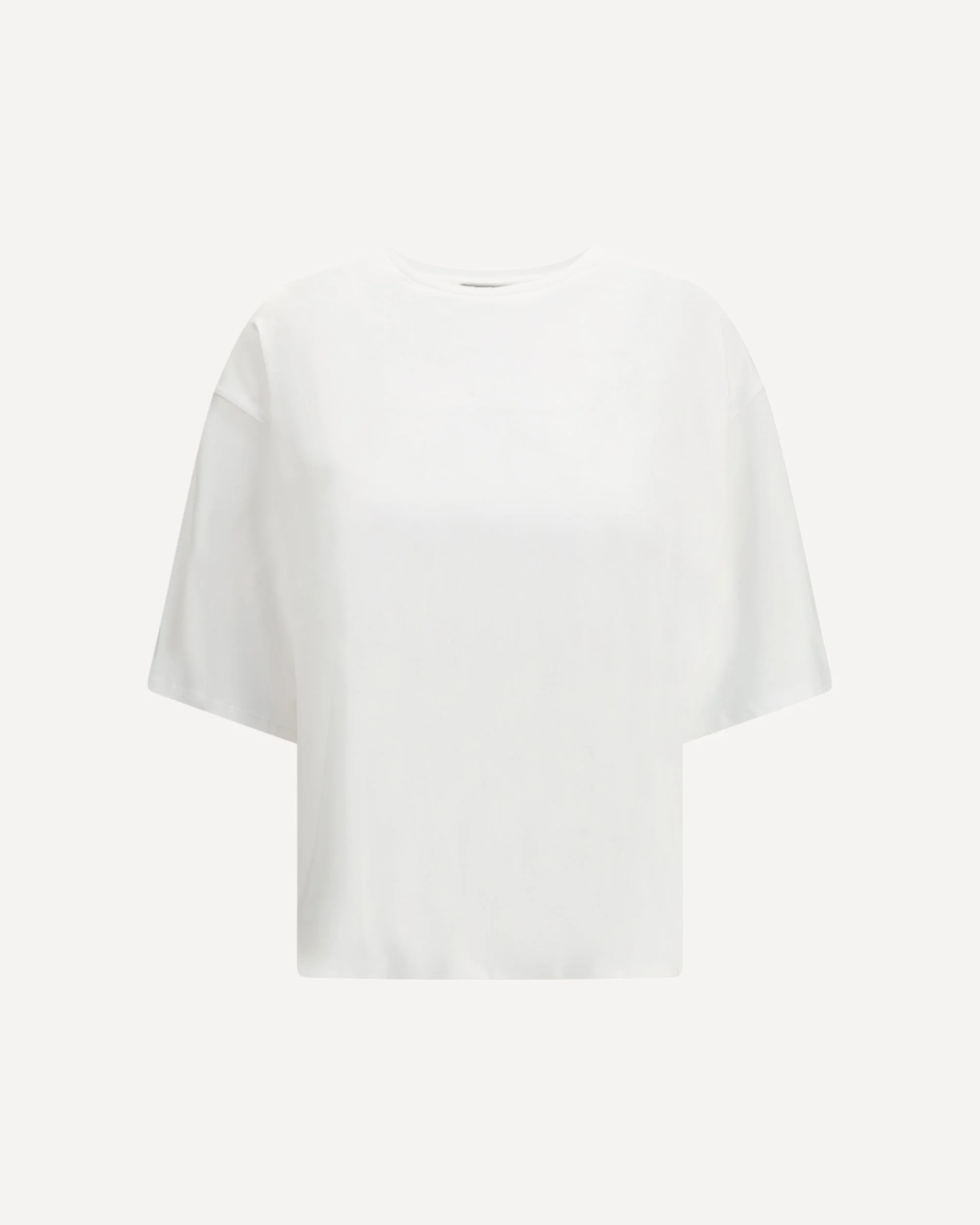 The Osis T-shirt by Loulou de Saison, clean and effortless, featuring a classic crew neckline and dropped shoulders that shape a relaxed silhouette. The short sleeves with slouched shoulders enhance its modern, easy-going appeal, making it a versatile everyday essential. DETAILS - Sku: OSIS_WHITE - Season: SS26 - Fit: Regular - Composition: GENERAL 100% Cotton - MADE IN PORTUGAL
