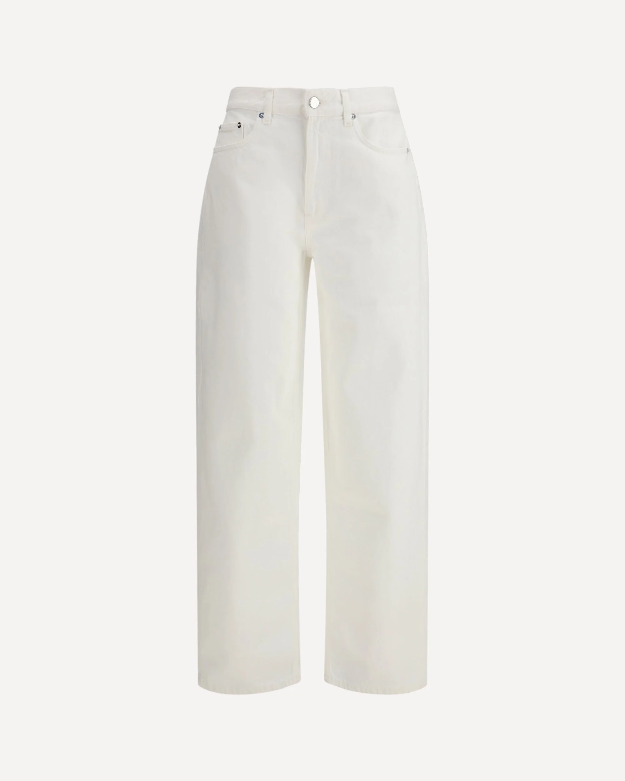 The Samur LDS Jeans by Loulou de Saison are crafted from non-stretch organic cotton denim, defined by a relaxed straight-leg silhouette with a naturally effortless attitude. The fabric shows subtle fading throughout, enhancing the lived-in character of the design. Finished with classic five-pocket styling, belt loops and a zip fly, they are completed by a discreet logo patch at the back waistband, offering a refined take on an everyday essential. DETAILS - Sku: SAMURLDS_IVORY - Season: SS26 - Fit: Regular - Composition: GENERAL 100% Cotton - MADE IN ITALY