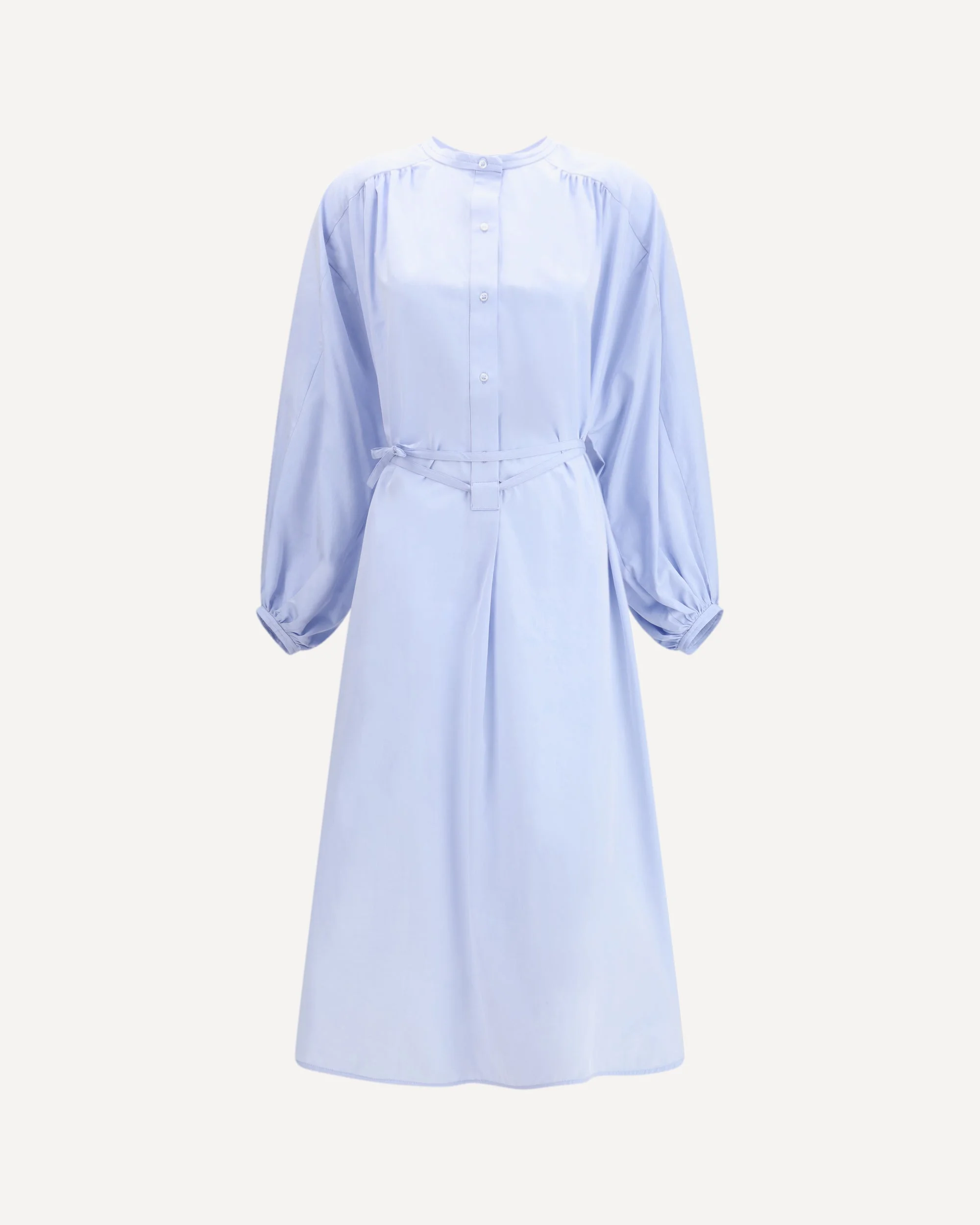 The Vitti Shirt Dress by LouLou de Saison is made from stiff cotton poplin, ensuring comfort and freshness. The loose fit, generous proportions, and midi length are enhanced by the generous raglan sleeves with cuffs, creating an airy silhouette that is perfect for summer. The stand-up collar, hidden button closure, and fabric belt in the same material complete the details, making this dress a versatile and sophisticated piece for any summer occasion. DETAILS - Sku: VITTI_STORM - Season: SS26 - Fit: Regular - Composition: GENERAL 100% Cotton - MADE IN ROMANIA