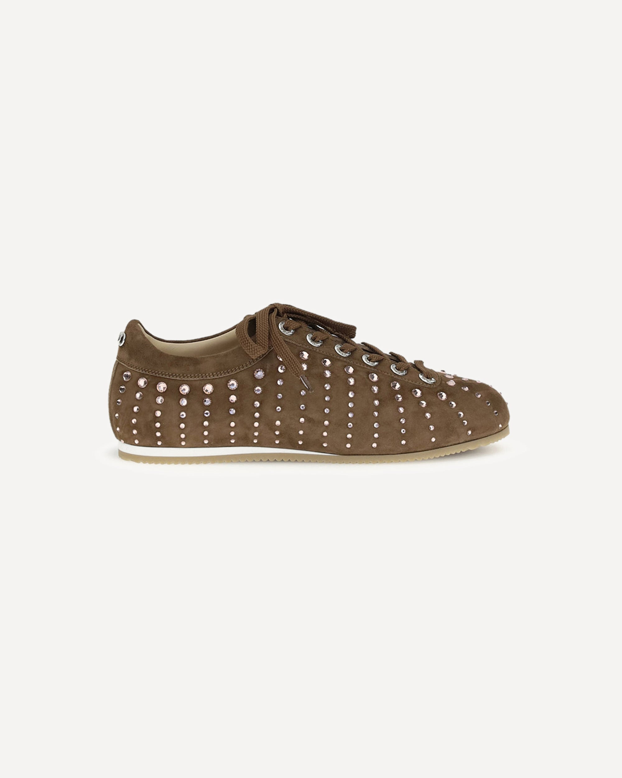 Mach&Mach's Crystal Ray Sneakers are made of suede and feature a bold, contemporary style. They feature a silhouette with a round toe, flat sole and lace-up closure. The design is embellished with all-over round studs, which add a gritty and sophisticated touch. DETAILS - Sku: PF25S103010SUEBRW_BROWN - Season: AW25 - Composition: UPPER 100% Calf Leather Bos Taurus SOLE 100% Rubber - MADE IN ITALY