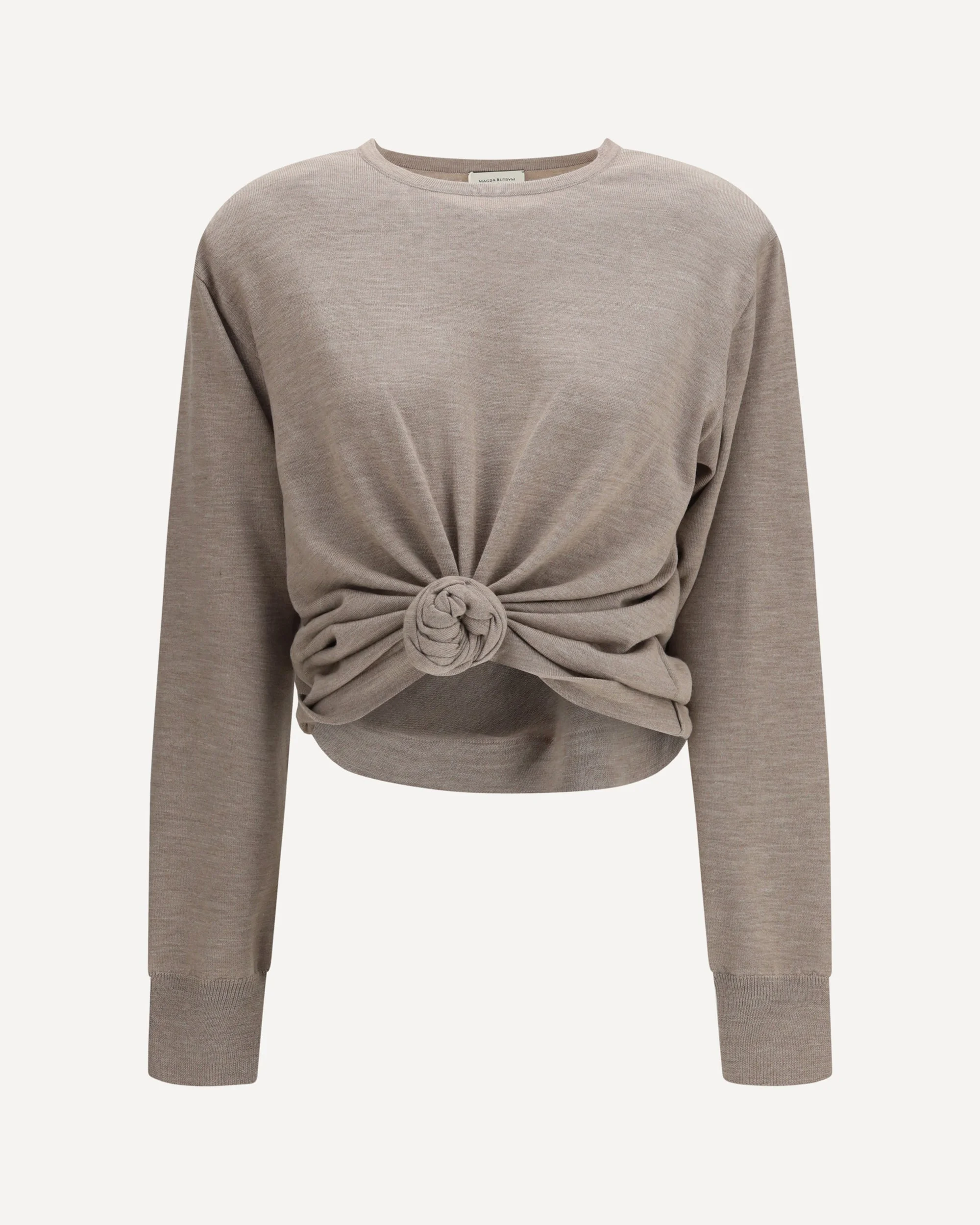 The Knotted Longsleeve by Magda Butrym is crafted from lightweight wool and features a gathered front with a central knot detail at the waist, shaping the silhouette. It includes detachable shoulder pads for adjustable structure and a subtle embroidered logo on the back yoke. A refined piece that blends femininity with tailored construction. DETAILS - Sku: 361526_BEIGE - Season: SS26 - Fit: Regular - Composition: GENERAL 100% Wool Ovis Aries - MADE IN ITALY