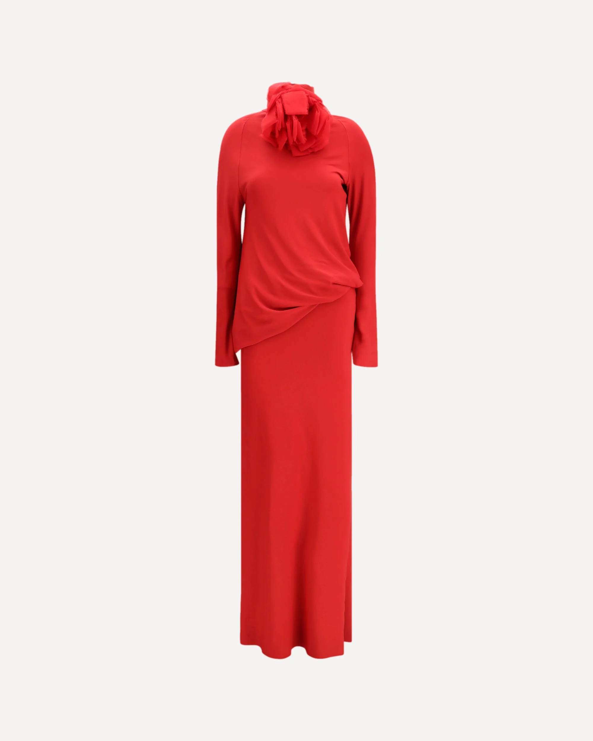 The long open-back Dress with high neck embodies understated sophistication, crafted from soft viscose-silk jersey with a hint of stretch. Long raglan sleeves and a draped blouson-style top contrast elegantly with the fluid, body-skimming skirt. The front is defined by a modest high collar, while the back reveals an open design that creates a striking, unexpected effect. The collar fastens at the back with five buttons, and a detachable floral brooch adds a refined, feminine accent that can be styled as desired. DETAILS - Sku: 330426_RED - Season: SS26 - Fit: Slim - Composition: GENERAL 81% Viscose 15% Silk 4% Elastane - MADE IN POLAND
