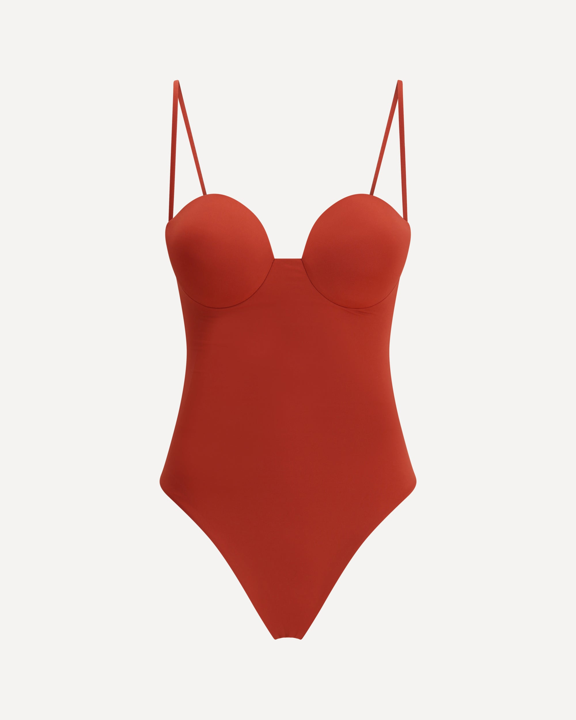 Magda Butrym's One Piece Swimsuit, part of its first swimwear collection, comes in a striking bright red. Featuring a retro bustier silhouette, it enhances the form with elegance and femininity, perfectly embodying the brand's iconic and refined aesthetic. DETAILS - Sku: 800725_RED - Season: AW25 - Fit: Slim - Composition: GENERAL 82% Polyamide 18% Elastane - MADE IN ITALY