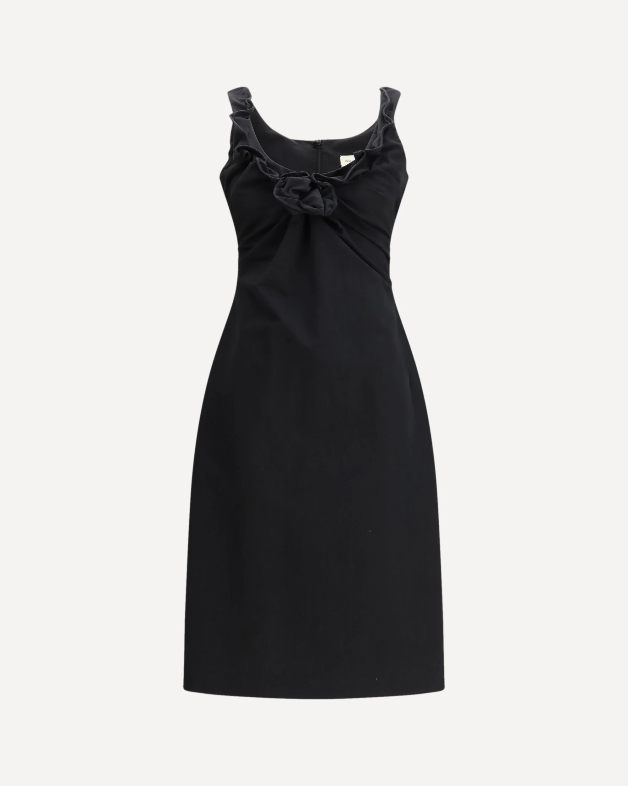 The sleeveless Dress with a draped neckline by Magda Butrym conveys refined, tailored elegance, crafted from a soft cotton-blend fabric that offers both comfort and structure. The deep oval neckline is framed by delicate draping with a subtle ruffled trim that gathers at the bust, creating a graceful focal point. The silhouette is fitted through the waist, enhanced by shaping darts at the back and an interior lining for added support. It fastens at the center back with a concealed zipper and inner button, finished with a small vent that adds ease of movement and understated femininity. DETAILS - Sku: 228426_BLACK - Season: SS26 - Fit: Slim - Composition: OUTER 67% Cotton 33% Polyamide INNER 100% Silk - MADE IN POLAND