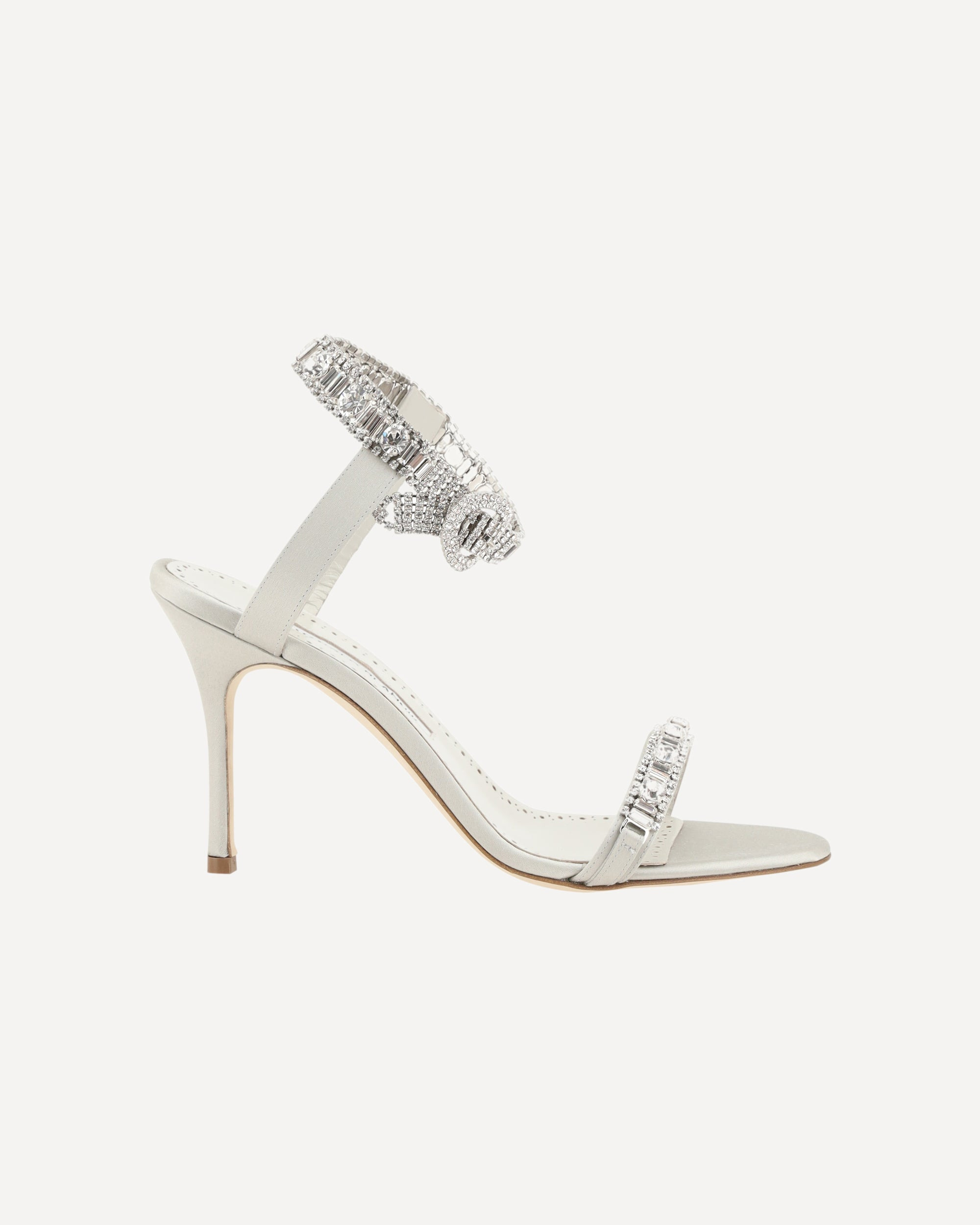 Manolo Blahnik's Asasan Satin Sandals are an ode to sophistication and luxury. Made of silk satin, they feature an ankle closure with an adjustable buckle, embellished with sparkling rhinestones. The front strap, also covered in rhinestones, adds a touch of sparkle, while the leather stiletto heel lends elegance and momentum to the silhouette. DETAILS sku 4241930_0334 composition: FABRIC 100% color group: SILVER gender: WOMAN season: SS25 size chart: SHOES IT category name: SANDALS dimensions: 9 cm