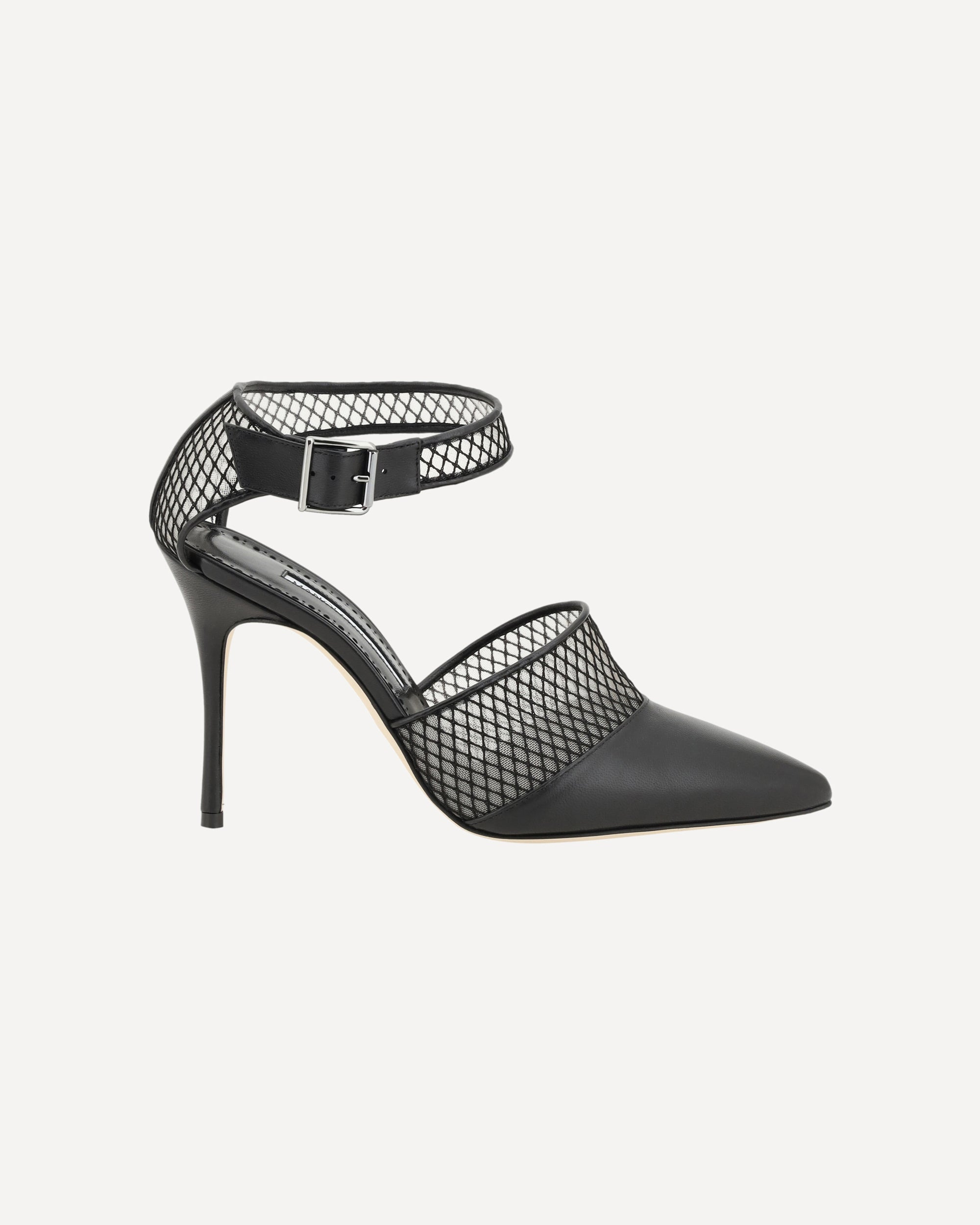 Manolo Blahnik's Jatelah Nappa Pumps combine sophistication with a bold twist. The mesh design on the upper and heel creates a delicate and sophisticated effect, while the adjustable buckle closure allows for a perfect fit. The leather stiletto heel slims the figure, while the almond toe adds elegance. DETAILS sku 4241851_0015 composition: CALF LEATHER BOS TAURUS 100% color group: BLACK gender: WOMAN season: SS25 size chart: SHOES IT category name: PUMPS dimensions: 10.5 cm