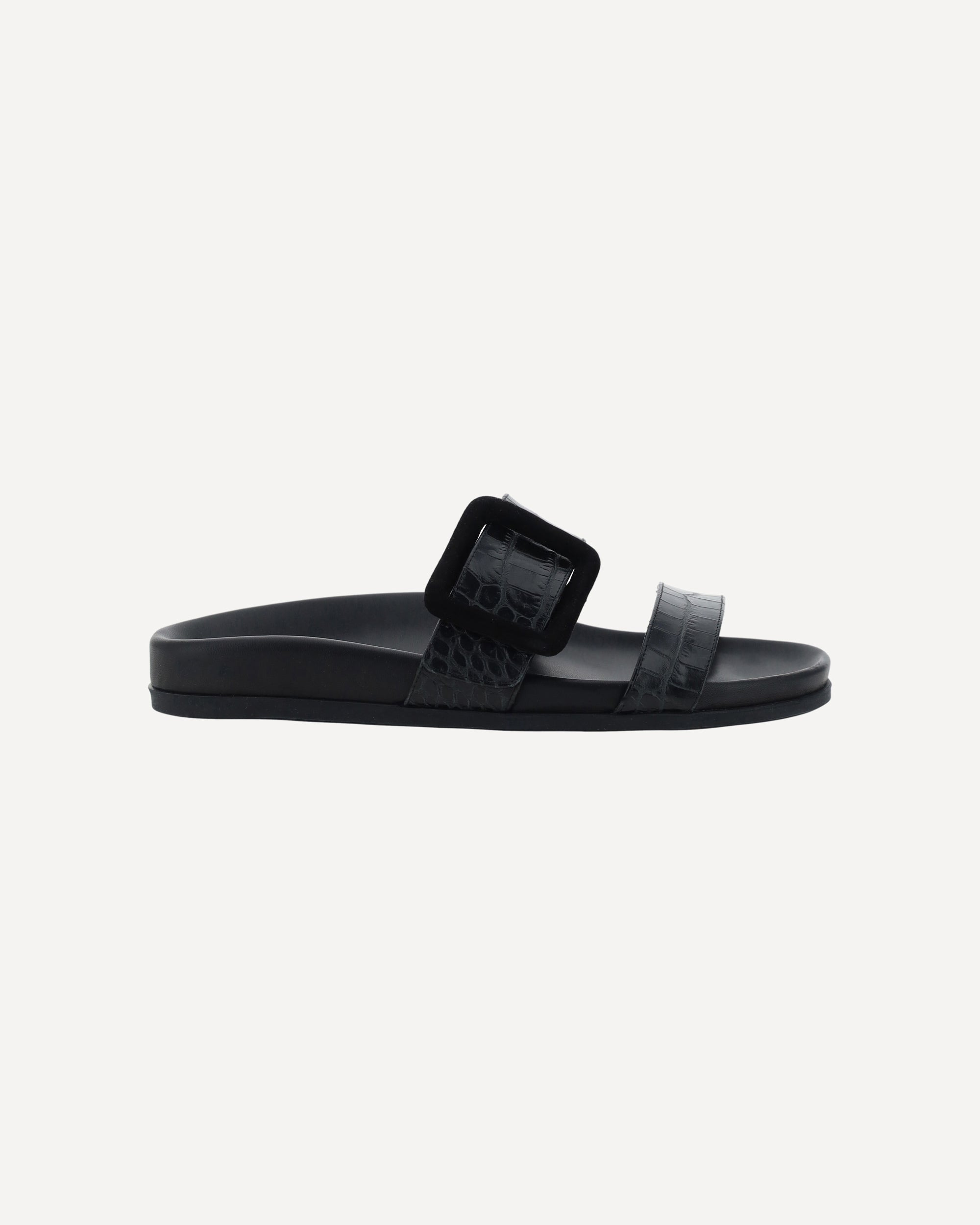 Calfskin Mayfu Sandals by Manolo Blahnik, featuring a double strap at the back, a flat sole, a croc-effect leather design, a round toe, a rectangular embossed applique buckle at the front, and a contrasting logo-embossed insole. DETAILS sku 2241662_0015 composition: RUBBER 100% CALF LEATHER BOS TAURUS 100% color group: BLACK gender: WOMAN season: AW24 size chart: SHOES IT category name: SANDALS