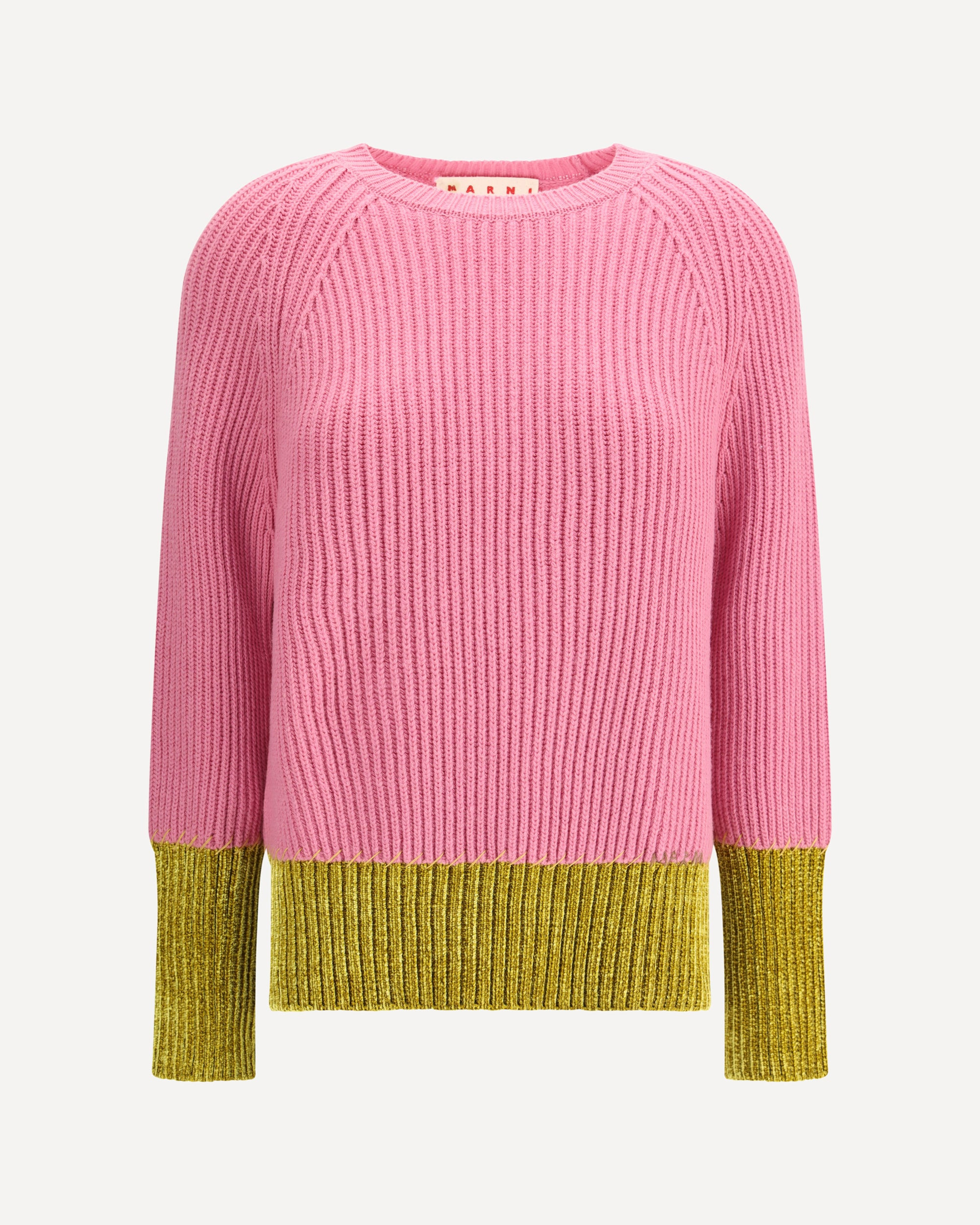 Marni's wool Sweater features a color-block design made from a wool and viscose blend yarn, knitted in English rib. With a regular fit, long sleeves and a crew neckline, it is embellished with a hand-embroidered Marni logo and topstitching details on the bust and sleeves, adding a refined, handcrafted touch. DETAILS - Sku: GCMD0632Q0_BIC33 - Season: AW25 - Fit: Regular - Composition: GENERAL 100% Fleece Wool - MADE IN ITALY