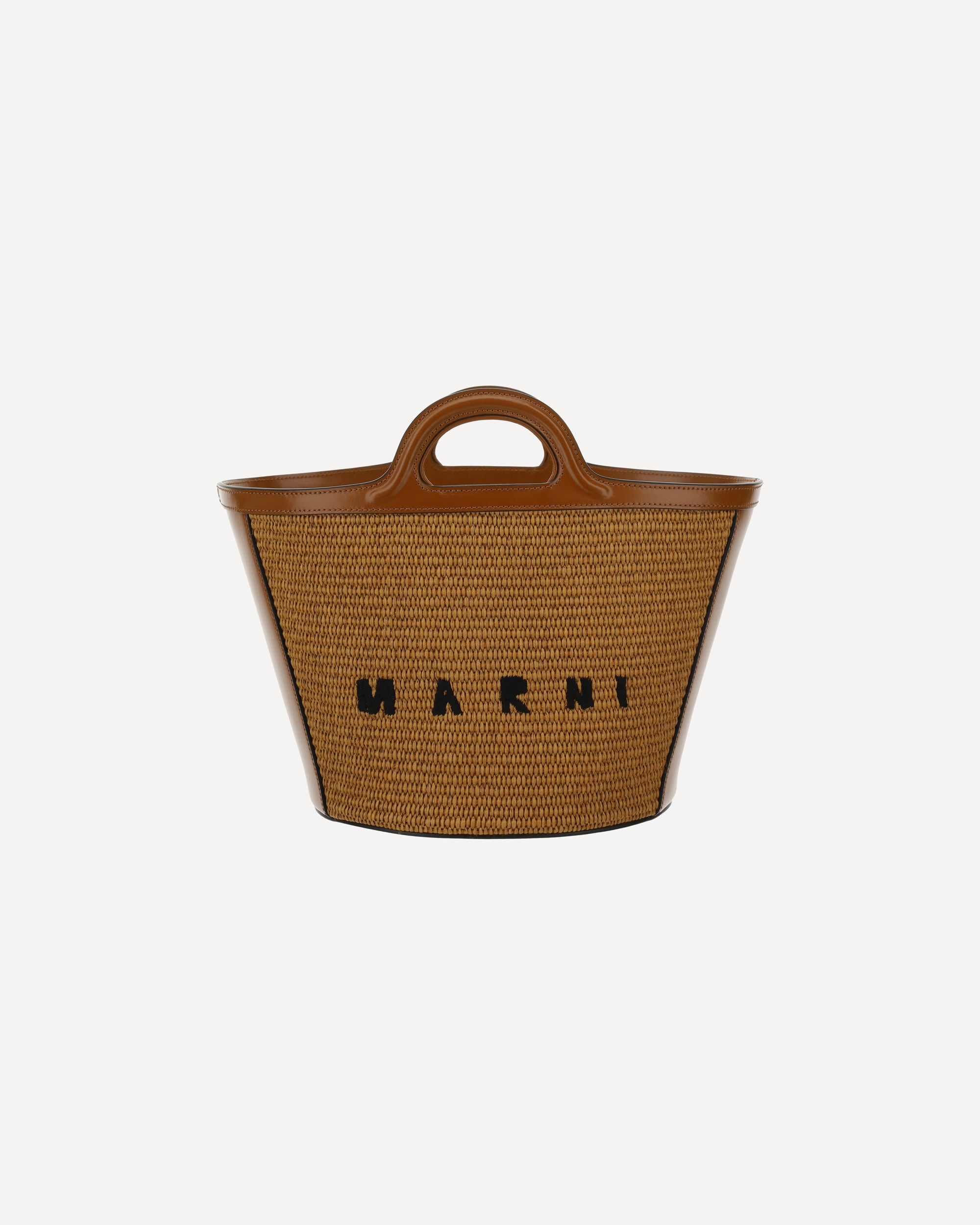 Tropicalia Bucket Bag by Marni, all-over raffia design, contrasting leather trim and details, double round and fixed leather top handles, adjustable flat shoulder strap, interior drawstring closure, matching fabric lining, iconic brand monogram embroidered in contrasting color on the front, interior zipper pocket. DETAILS - Sku: BMMP0068Q0P3860_00M50 - Season: AW25 - Dimension: 27x27x15 - Composition: GENERAL 70% Cotton 30% Calf Leather Bos Taurus - MADE IN ITALY