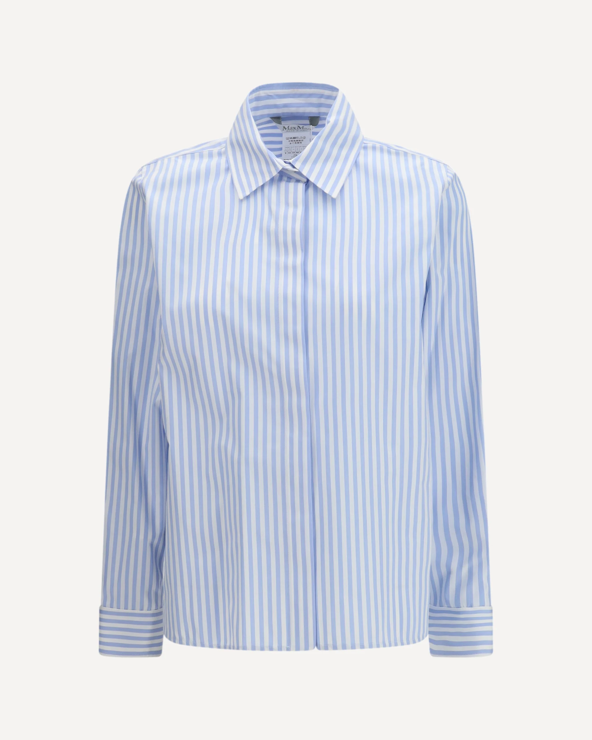 The Maroso Shirt in cotton poplin by Max Mara, with its striped pattern, is an elegant and modern garment, perfect for a refined and versatile look. The short pointed collar and concealed button closure give it a clean and sophisticated look. The rounded cuffs with buttons add a delicate touch, while the side slits at the bottom and the back yoke ensure a comfortable and dynamic fit. DETAILS - Sku: 2611111111600_002 - Season: SS26 - Fit: Regular - Composition: GENERAL 100% Cotton