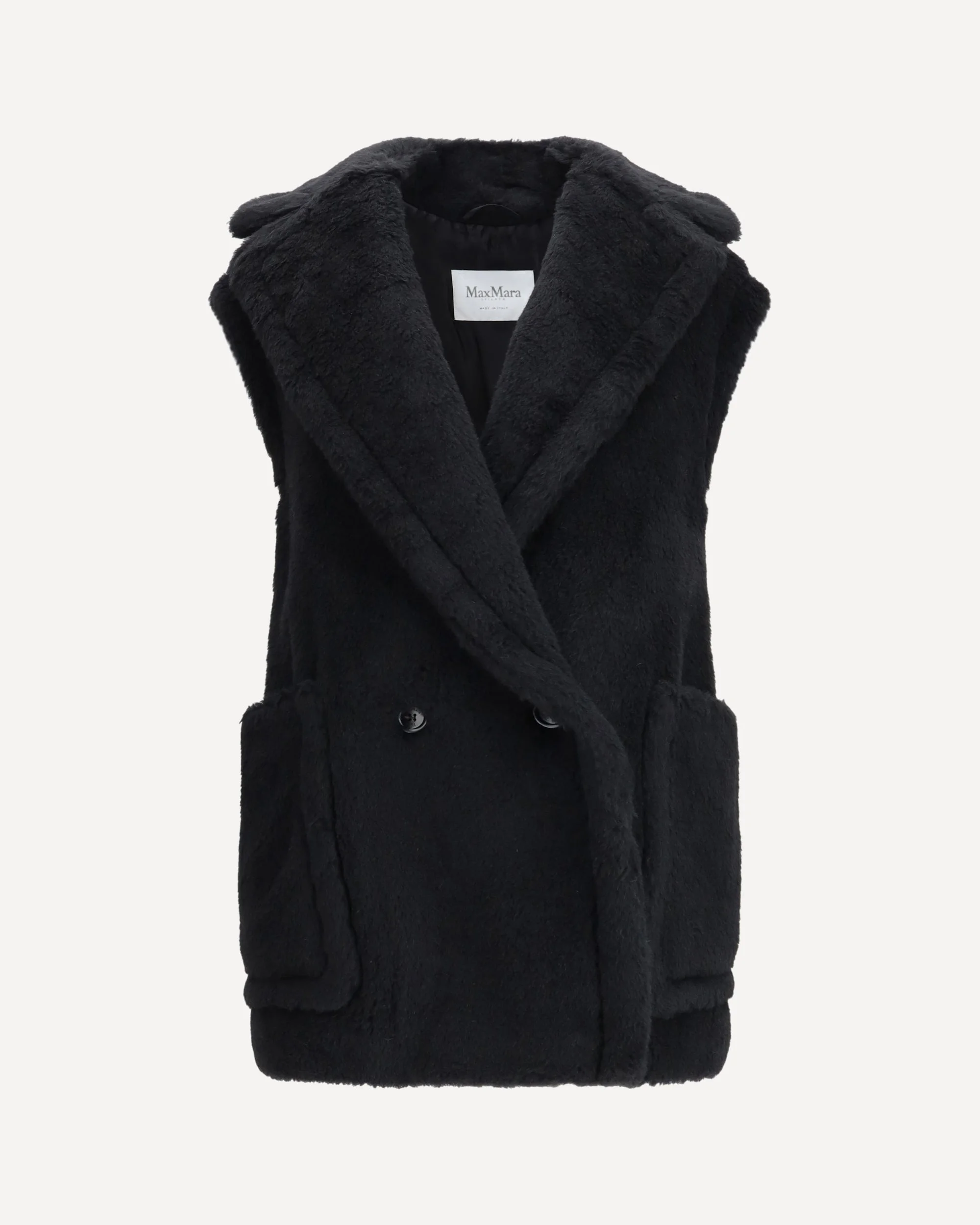 The Teddy alpaca and wool Vest by Max Mara reinterprets the maison’s iconic fabric in a contemporary sleeveless version. Oversized in volume, it is crafted from alpaca and wool on a silk base, enhanced by a maxi lapel collar and a double-breasted front with two visible buttons. Large patch pockets add a functional yet refined touch, while the stretch jacquard Monogram lining underscores the brand’s dedication to luxurious detail. DETAILS - Sku: 2521276253600_008 - Season: AW25 - Fit: Oversize - Composition: OUTER 62% Alpaca Vicugna Pacos 26% Fleece Wool 12% Silk INNER 100% Viscose - MADE IN ITALY