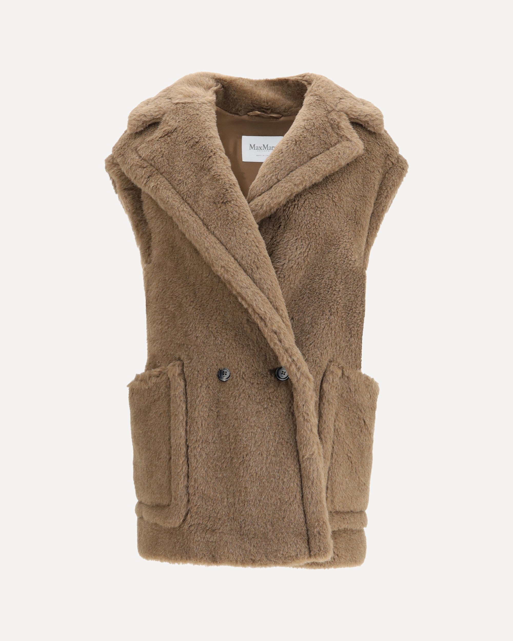 The Teddy alpaca and wool Vest by Max Mara reinterprets the maison’s iconic fabric in a contemporary sleeveless version. Oversized in volume, it is crafted from alpaca and wool on a silk base, enhanced by a maxi lapel collar and a double-breasted front with two visible buttons. Large patch pockets add a functional yet refined touch, while the stretch jacquard Monogram lining underscores the brand’s dedication to luxurious detail. DETAILS - Sku: 2521276253600_004 - Season: AW25 - Fit: Oversize - Composition: OUTER 62% Alpaca Vicugna Pacos 26% Fleece Wool 12% Silk INNER 100% Viscose - MADE IN ITALY