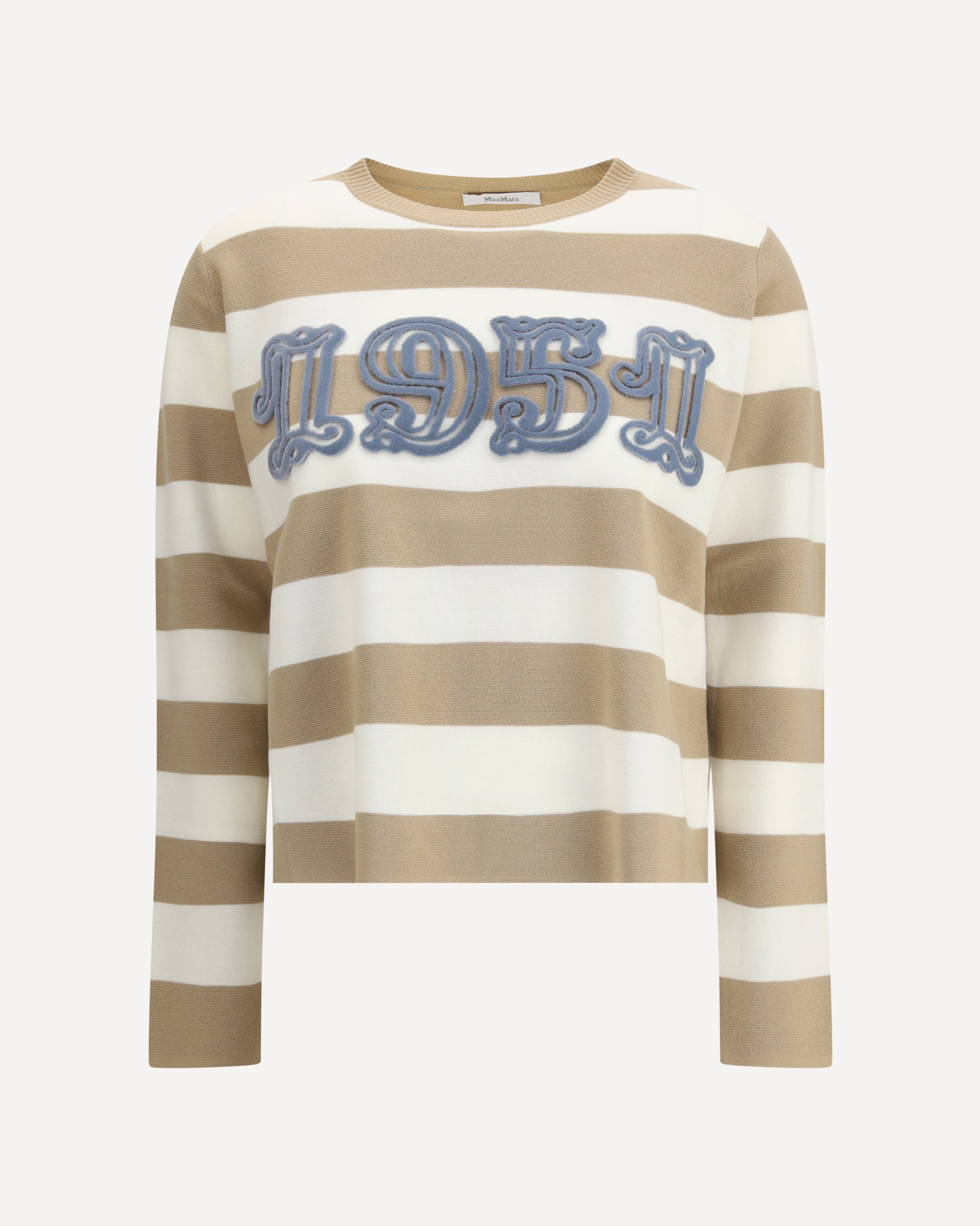 Max Mara's Viterbo Sweater is made of pure virgin wool and features a brown and white striped pattern, enhanced by "1951" flocked embroidery on the front. An iconic garment with an essential design, perfect for creating sophisticated and comfortable looks during the cold season. DETAILS - Sku: 2521366091600_008 - Season: AW25 - Fit: Regular - Composition: GENERAL 100% Fleece Wool - MADE IN ITALY