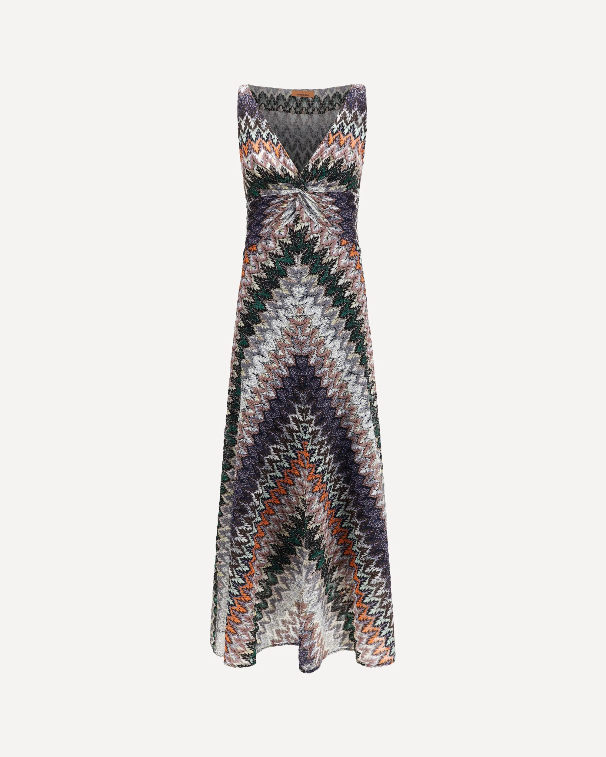 The sleeveless lond Dress by Missoni features iconic chevron knit, a signature element of the brand’s aesthetic. Designed with a deep V-neckline that elongates the silhouette, it is tailored in a slim fit to enhance the figure with refined femininity. The zigzag pattern adds movement and texture, making it ideal for a sophisticated yet contemporary look. DETAILS - Sku: DS26SG1SBR014Z_S72OW - Season: SS26 - Fit: Regular - Composition: GENERAL 82% Polyester 18% Elastane - MADE IN ITALY