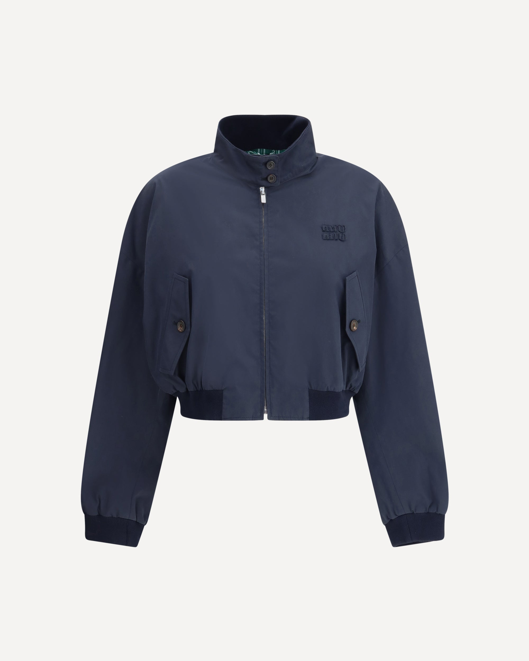 Miu Miu's bomber Jacket reinterprets a streetwear classic with refined details. It features a front zipper closure, high collar with two buttons, and ribbed hem and cuffs for a comfortable fit. The interior is lined with check pattern, while side welt pockets add functionality. Completing the design is the iconic logo stitched on the front, the brand's distinctive signature. DETAILS - Sku: ML1193SOOO17HM_F0008 - Season: AW25 - Fit: Regular - Composition: GENERAL 100% Cotton - MADE IN ITALY
