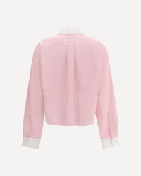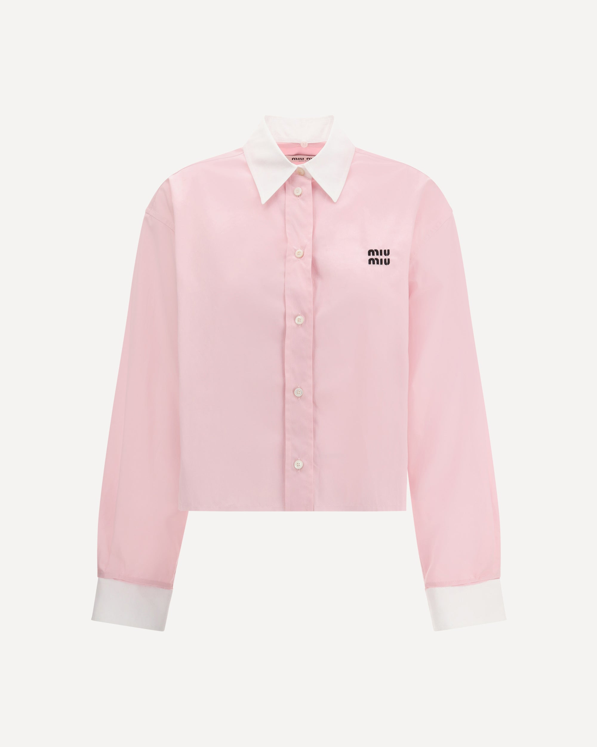 Miu Miu's Cropped Shirt combines bold styling with tailored details. Featuring a classic collar and contrasting cuffs, it has a button closure and a stitched logo on the front. Frayed hems add a gritty, contemporary touch. DETAILS - Sku: MK1971SOOO10RG_F0028 - Season: AW25 - Fit: Regular - Composition: GENERAL 100% Cotton - MADE IN ITALY