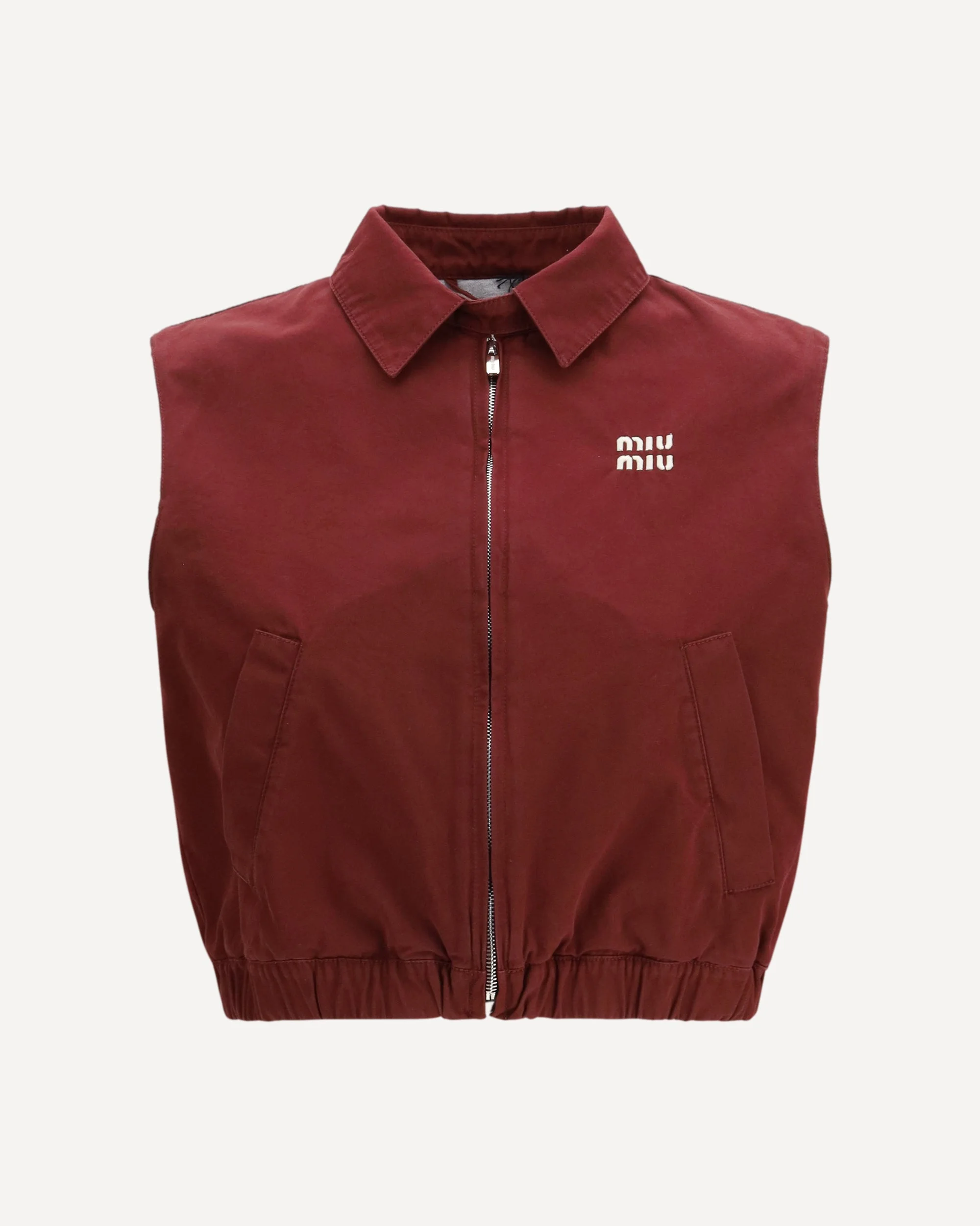 The cropped Vest by Miu Miu is a sophisticated and versatile garment, featuring a classic collar and a zipper and button closure at the neck. The elasticated hem ensures a comfortable and snug fit, while the contrasting embroidered logo on the front adds a distinctive touch. The two welt pockets complete the design, offering practicality without compromising on style. An ideal vest for those looking for a modern and refined look. DETAILS - Sku: ML1470SOOO19CV_F0399 - Season: SS26 - Fit: Slim - Composition: GENERAL 100% Cotton - MADE IN ITALY