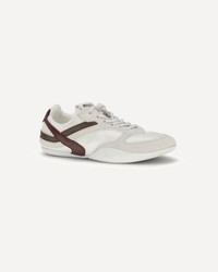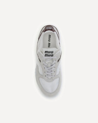 The Gymnasium Sneakers by Miu Miu combine a sporty design with modern elegance, ideal for those seeking comfort without sacrificing style. The front lace-up closure allows for a secure and customized fit, while the flat rubber sole offers a stable and comfortable walk. The contrasting logo-embellished heel reinforcement adds a distinctive touch, while the logo-embellished insole reflects the attention to detail typical of the house. The paneled design lends dynamism to the model. DETAILS - Sku: 5E428EFA00571L_F0X97 - Season: SS26 - Composition: UPPER 50% Calf Leather Bos Taurus 50% Polyamide SOLE 100% Rubber - MADE IN ITALY