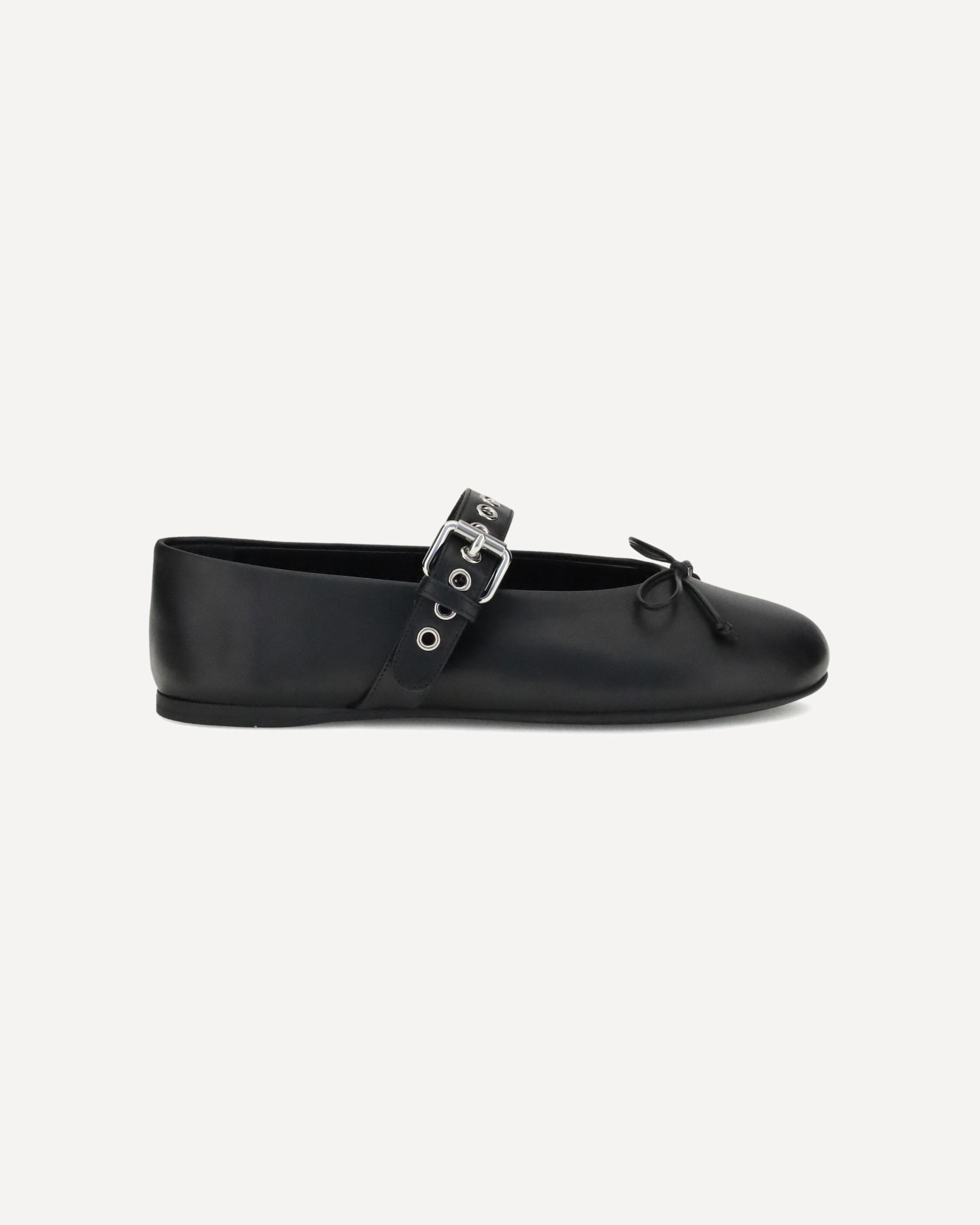Miu Miu's leather Ballerinas perfectly combine elegance and comfort. The flat sole provides practicality for everyday wear, while the adjustable buckle strap on the back of the foot offers a stable and secure fit. The design is enhanced by the round toe and front bow, giving a refined and versatile look suitable for any occasion. DETAILS - Sku: 5F210EF005070_F0002 - Season: AW25
