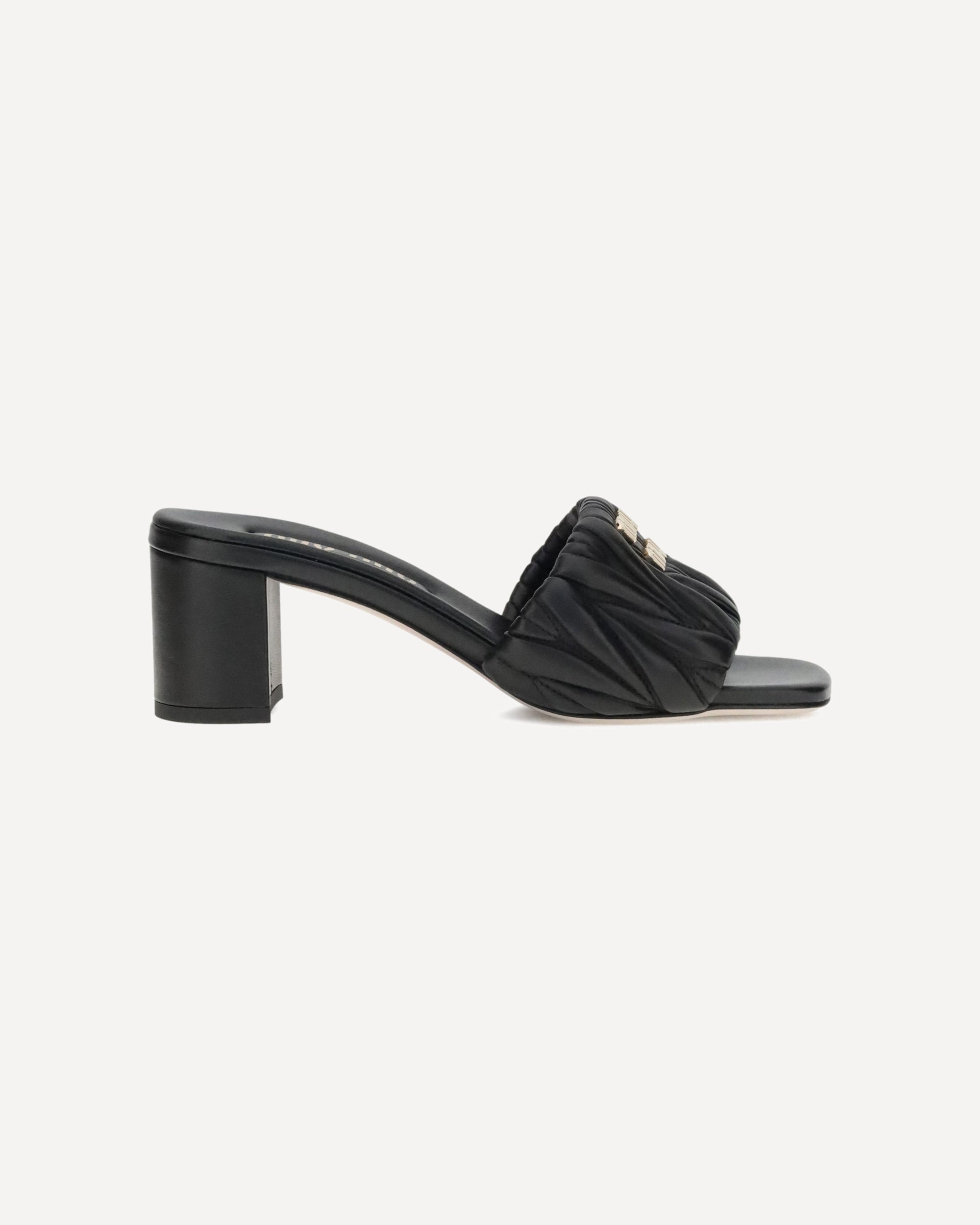 Miu Miu's lambskin Sandals combine elegance and comfort in a sophisticated design. With a squared toe and padded straps, they are embellished with a metal plaque featuring the iconic Miu Miu monogram on the front. The geometric heel lends a bold, modern touch, while the branded insole adds an exclusive, classy detail. DETAILS - Sku: 5XX657F05588T_F0002 - Season: AW25 - Composition: UPPER 100% Lamb Ovis Aries Aries SOLE 100% Calf Leather Bos Taurus - MADE IN ITALY