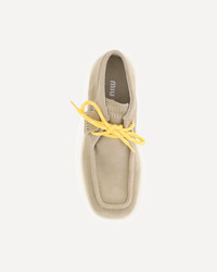 Miu Miu's leather Ankle Boots combine retro inspiration and contemporary character. With a platform sole and squared toe, they reinterpret the classic ankle boot model in a bold key. The colorful laces add a playful touch, while the embossed logo on the tongue and logoed leather tag attached to the laces complete the look with iconic details. DETAILS - Sku: 5T263EF045Z5O_F0379 - Season: AW25 - Composition: SOLE 100% Rubber UPPER 100% Calf Leather Bos Taurus - MADE IN ITALY