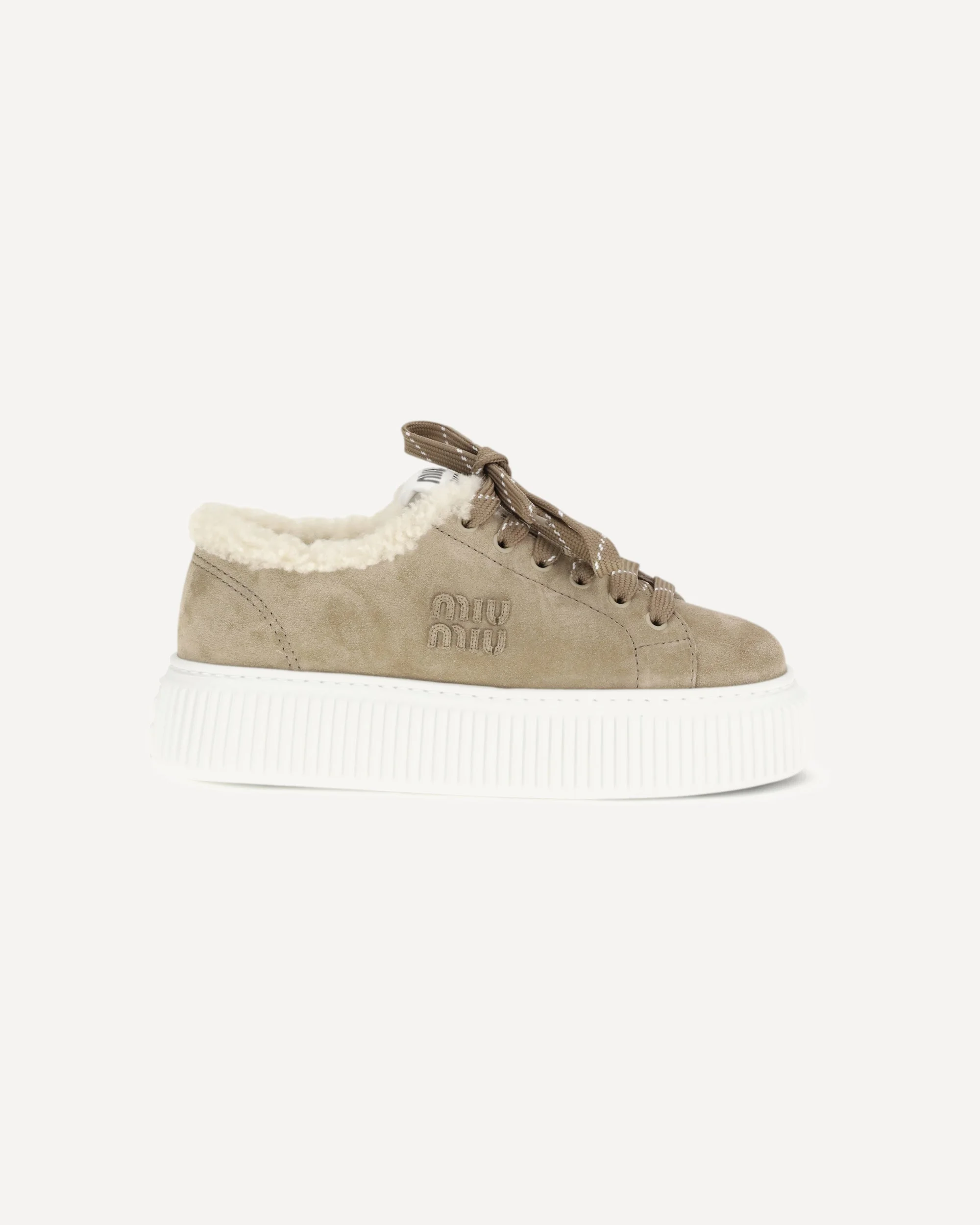 The Suede and sheepskin Sneakers by Miu Miu combine style and comfort with a soft suede upper with embroidered logo and warm sheepskin lining. The EVA platform sole, featuring stripes and a logo, lends a bold, contemporary touch, while the star-patterned tread adds personality. Front laces and screen-printed logo on tongue and insole complete the design. DETAILS - Sku: 5E389EFZF05Z0G_F0F24 - Season: AW25 - Composition: UPPER 100% Calf Leather Bos Taurus SOLE 100% Rubber - MADE IN ITALY