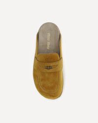 Miu Miu's Suede Mules feature an upper embellished with a leather horsebit with logoed metal coin. Equipped with a leather insole and EVA sole, they feature a tread decorated with stars and the screen-printed logo, combining comfort and distinctive style. DETAILS - Sku: 5D058EFDX10054_F0R55 - Season: AW25 - Composition: GENERAL 100% Calf Leather Bos Taurus - MADE IN ITALY