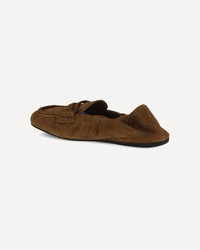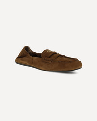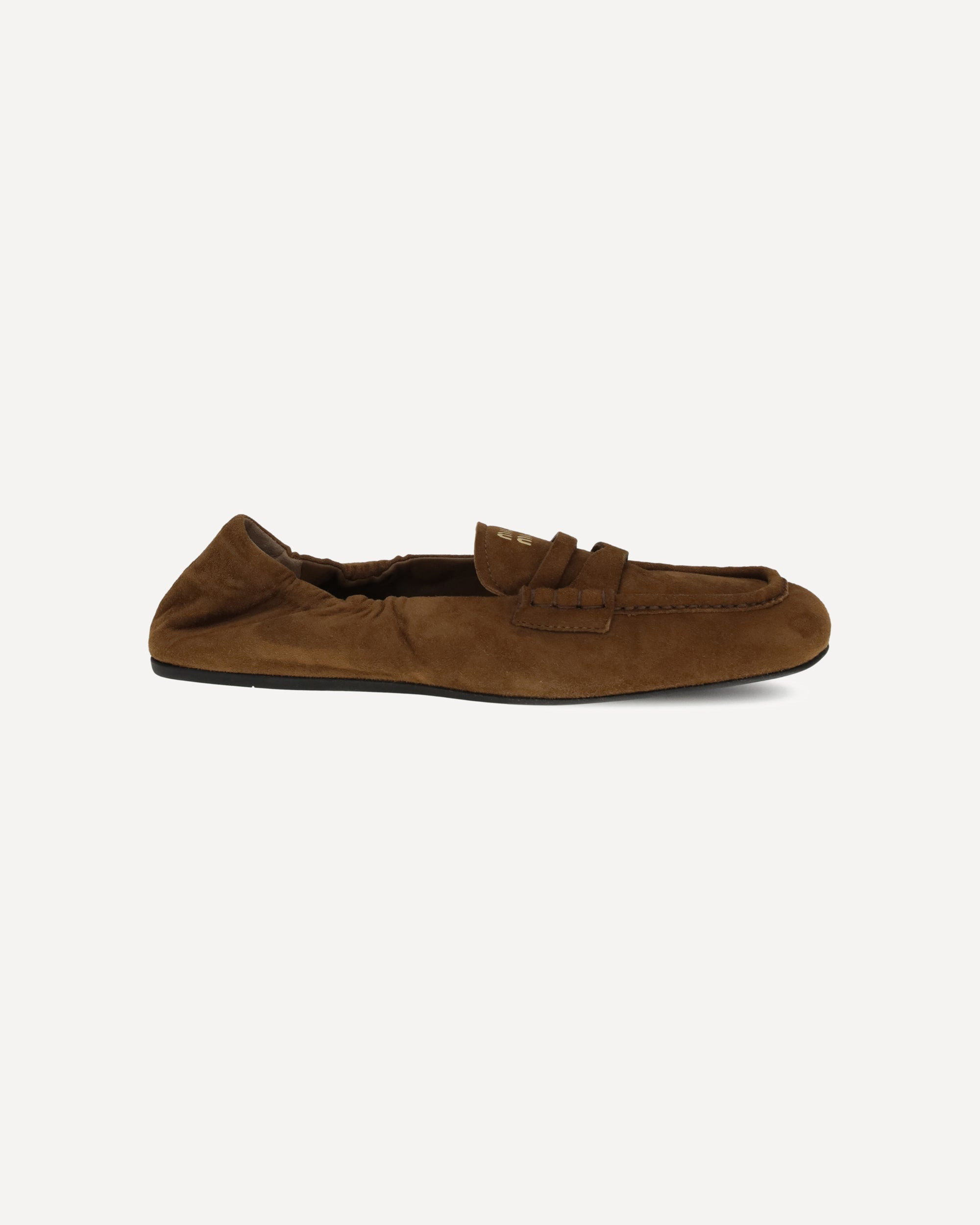 Miu Miu's Ruches Loafers, made of suede leather, combine comfort and style with refined details. The upper is embellished with a leather horsebit, while the lining and insole are leather to ensure softness and breathability. The rubber sole ensures a stable and comfortable walk. The logo is embossed on the tongue and screen-printed on the insole, completing an elegant and distinctive design. DETAILS - Sku: 5D341EFD005008_F0316 - Season: AW25 - Composition: GENERAL 100% Calf Leather Bos Taurus - MADE IN ITALY