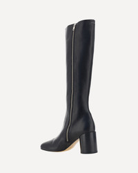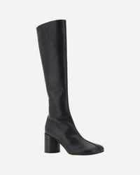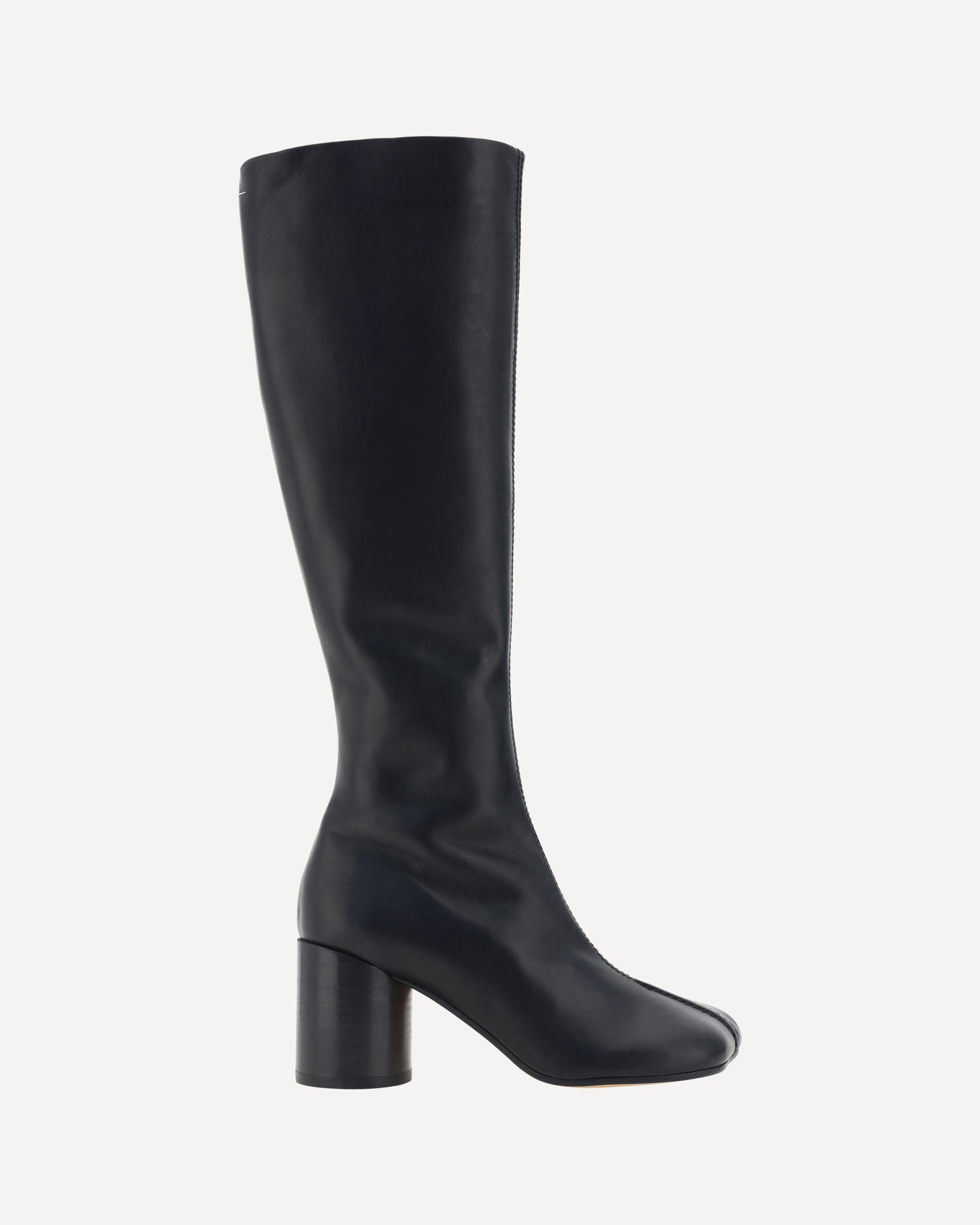 Leather Boots by MM6, iconic Tabi toe from Maison Margiela brand, closure by side chain, matching cylindrical heel, knee-length model. DETAILS sku S59WW0110P5000_T8013 composition: CALF LEATHER BOS TAURUS 100% color group: BLACK gender: WOMAN season: AW24 size chart: SHOES IT category name: BOOTS dimensions: 7 cm