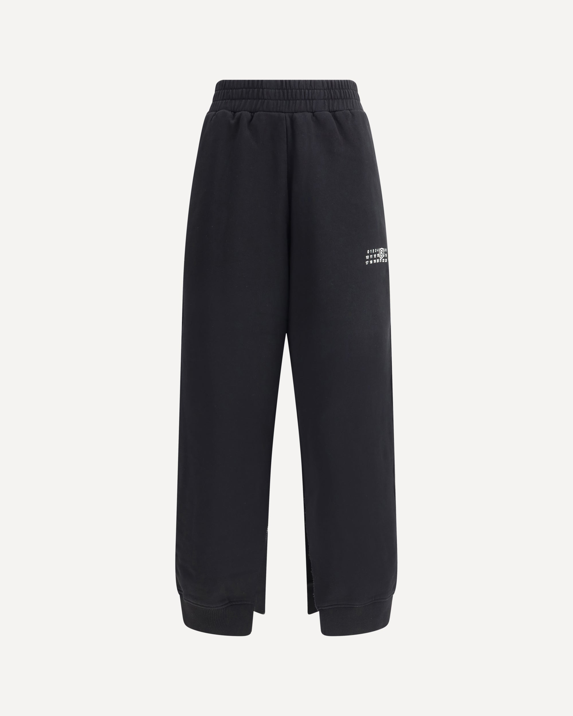 MM6 Maison Margiela's Sweatpants combine comfort and contemporary style. Featuring an elasticized waistband and side welt pockets, they feature the iconic contrasting printed logo on the front. The inside leg with two raw-cut slits adds an unexpected and distinctive detail, perfectly in line with the brand's experimental aesthetic. DETAILS - Sku: S52KA0546M25025_900 - Season: AW25 - Fit: Regular - Composition: GENERAL 100% Cotton - MADE IN PORTUGAL