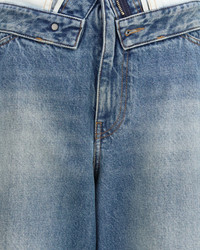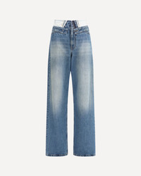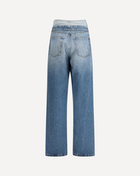 The straight-leg Jeans by MM6 rework classic denim through a subversive, deconstructed detail. The layered waistband creates a doubled effect that reveals raw edges and inner construction, highlighting the brand’s unconventional approach to tailoring. A faded wash and tobacco-colored stitching enhance the lived-in character of the piece, while the signature white stitch line at the back marks it unmistakably as MM6. Designed with a full-length wide-leg fit, the jeans fasten with a front zip and button, balancing conceptual design with everyday wearability. DETAILS - Sku: S52LA0271M30058_965 - Season: SS26 - Fit: Regular - Composition: GENERAL 100% Cotton - MADE IN ROMANIA