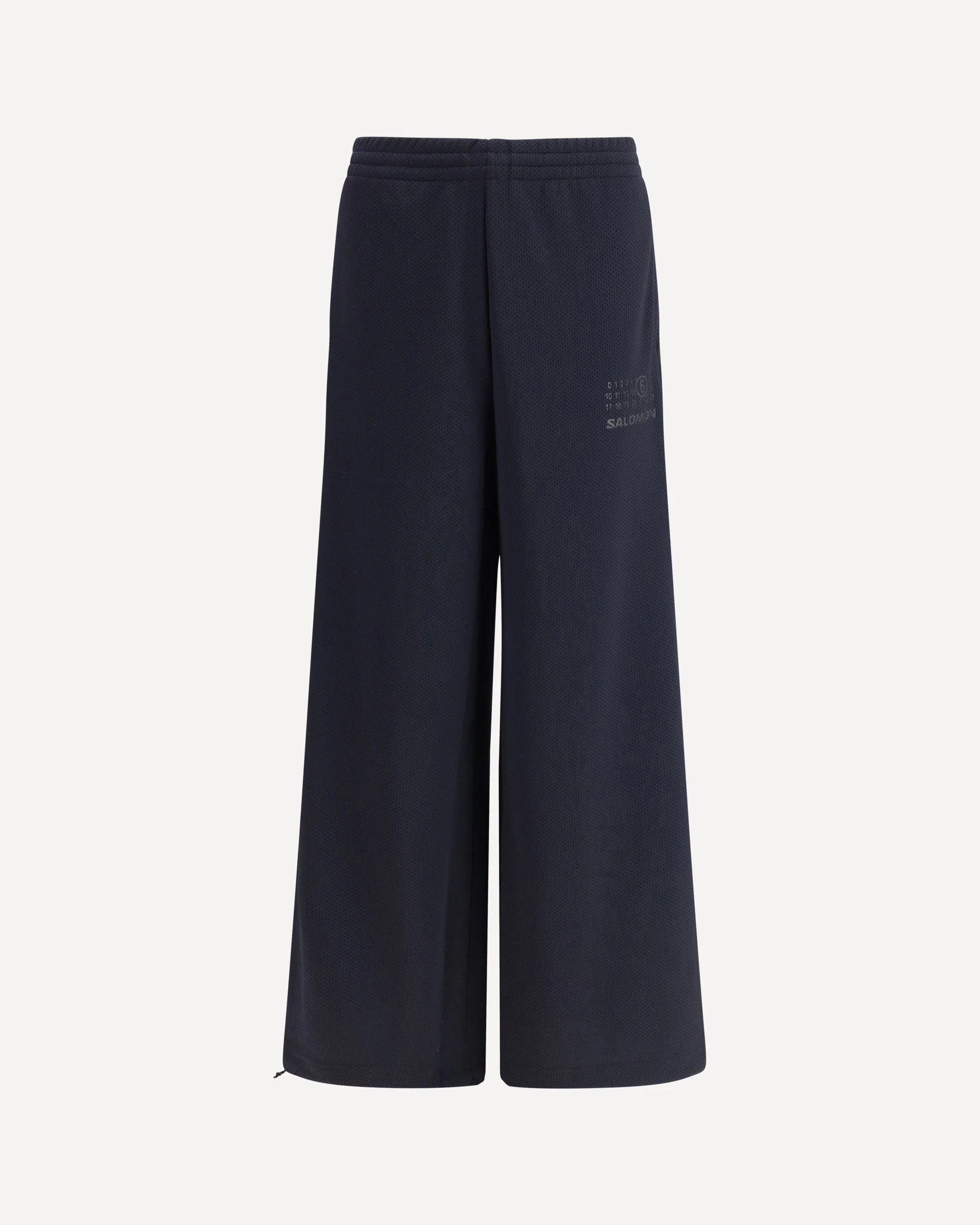 The Wide-Leg Track Pants from the Salomon x MM6 collaboration blend athletic functionality with avant-garde design. Crafted from a technical fabric with a perforated yet non-transparent texture, they offer breathability and lightness while maintaining a refined structure. The elastic waistband ensures comfort and ease of movement, while the collaboration logo printed on the left leg adds a bold, graphic finish. A statement piece that embodies the perfect fusion of performance and experimental style. DETAILS - Sku: SH0KA0058M20139_899 - Season: AW25 - Fit: Regular - Composition: GENERAL 100% Polyester - MADE IN INDONESIA