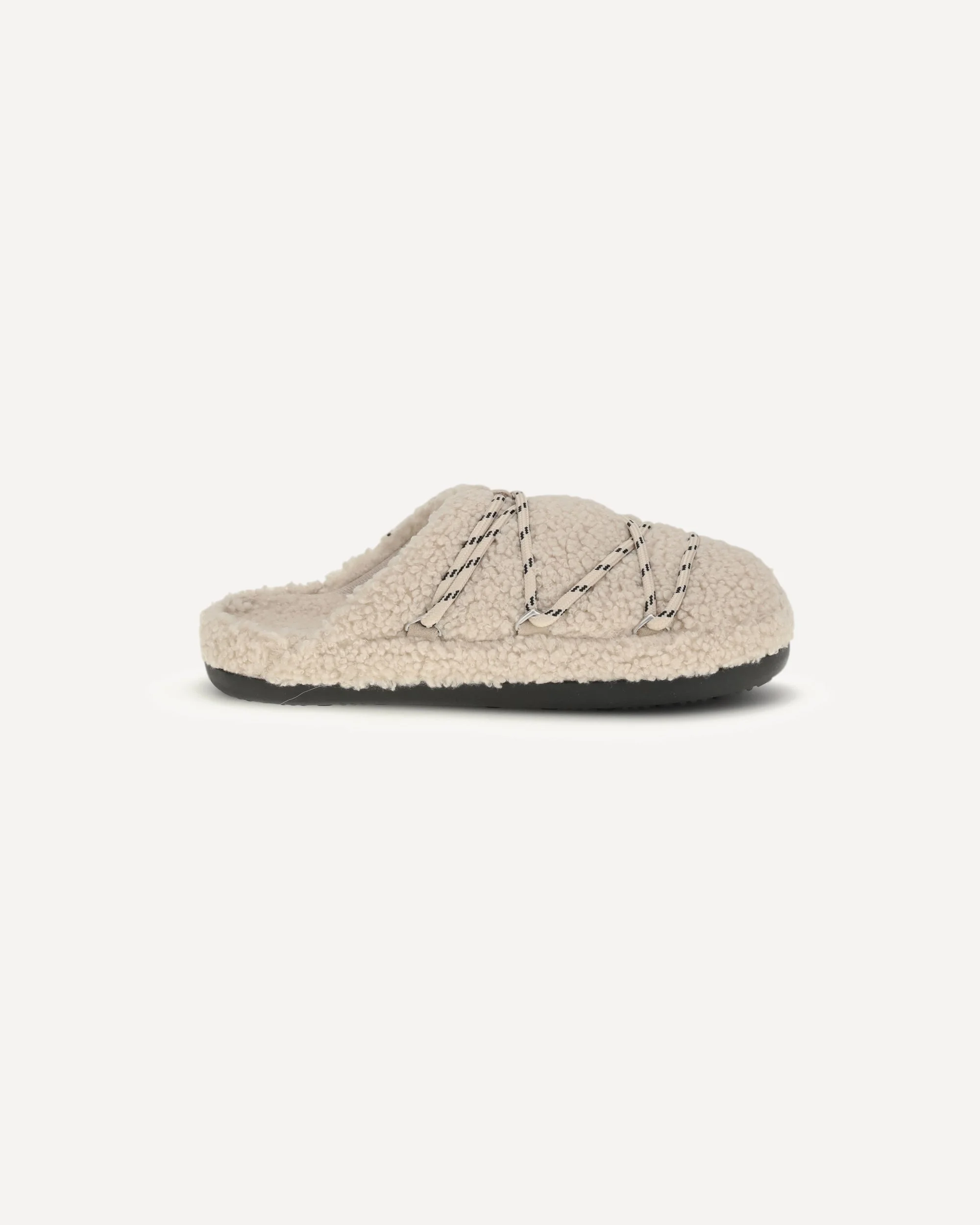 The Teddy Slipper by Moon Boot blends elegance, comfort, and cosmic coolness. Featuring the brand’s iconic lacing, a soft teddy finish, and a non-slip rubber sole, this genderless slip-on adapts effortlessly to indoor and outdoor settings, or wherever life takes you. The design includes crossed tubular laces, metal eyelets, a branded heel counter, and a cushioned midsole that ensures a soft, stable step. DETAILS - Sku: 80D2410040_L026 - Season: SS26 - Composition: UPPER 60% Polyamide 40% Calf Leather Bos Taurus SOLE 100% Rubber - MADE IN ROMANIA