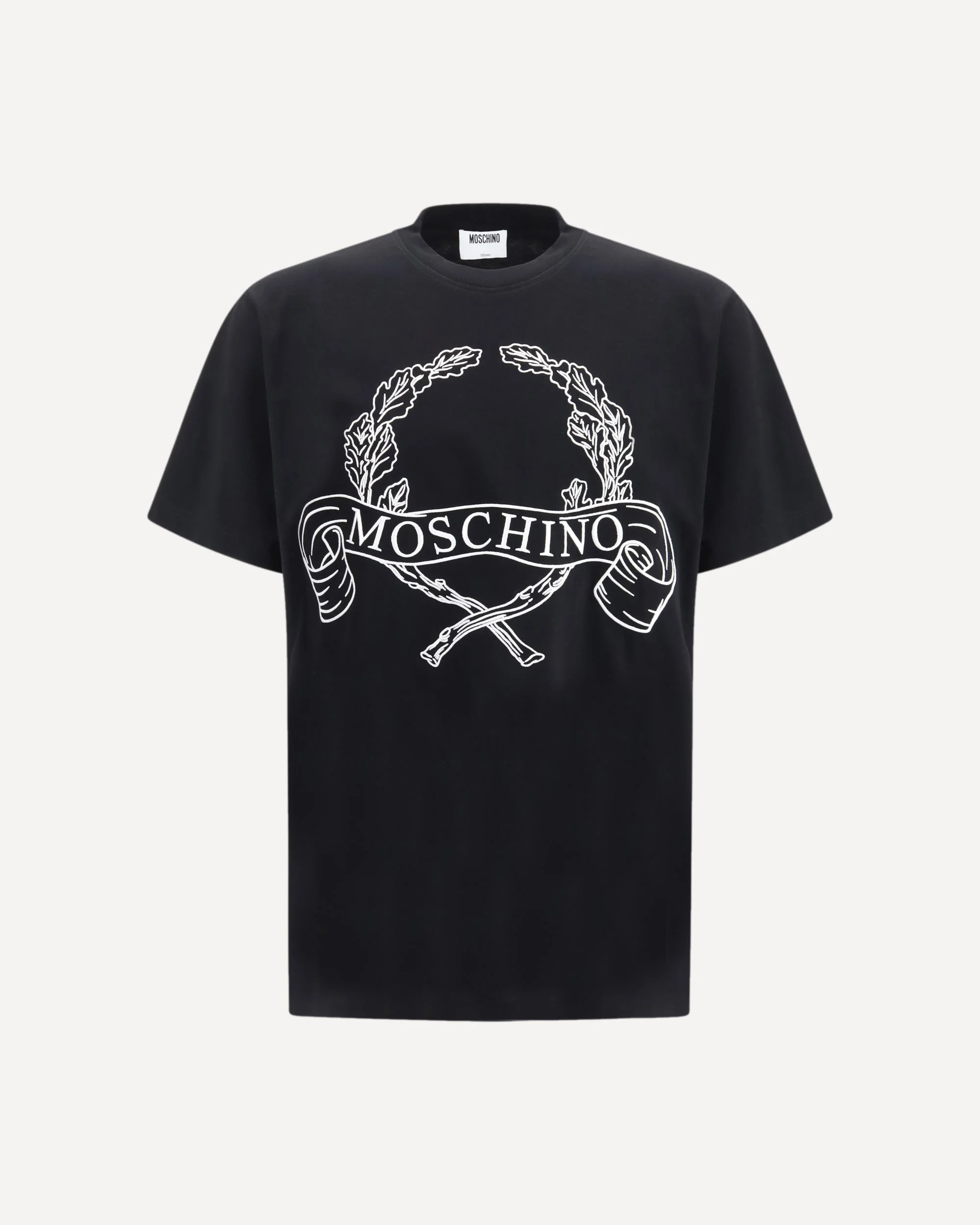 The Maxi Laurel Crown Embroidery T-shirt by Moschino is crafted from organic cotton jersey and features a front print with an archival maxi logo enhanced by an embroidered laurel crown. Designed with a crew neck, short sleeves and a regular fit, it offers a clean silhouette elevated by a distinctive and iconic detail. DETAILS - Sku: 261ZZA07220241_1555 - Season: SS26 - Fit: Regular - Composition: GENERAL 100% Cotton - MADE IN ITALY