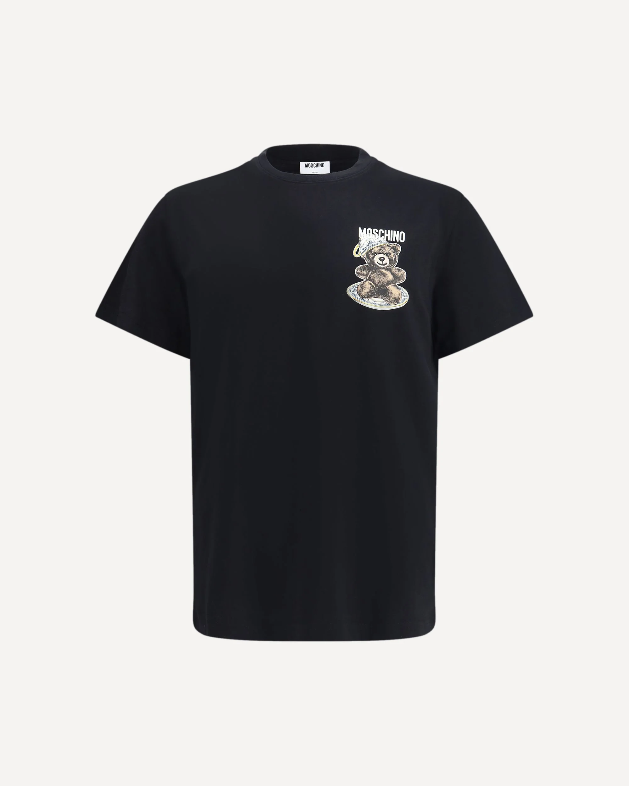 The cotton T-Shirt by Moschino stands out for its distinctive and bold design. The bear print on the front adds a playful and recognizable touch, making the garment instantly identifiable. The brand's iconic monogram, applied in contrast, reinforces Moschino's identity with a stylish and dynamic detail. The ribbed crew neck ensures a comfortable and perfect fit, while the monochrome pattern makes the T-shirt versatile and easy to match. DETAILS - Sku: 252ZZ0721252ZZ5241_1555 - Season: AW25 - Fit: Regular - Composition: GENERAL 100% Cotton - MADE IN PORTUGAL